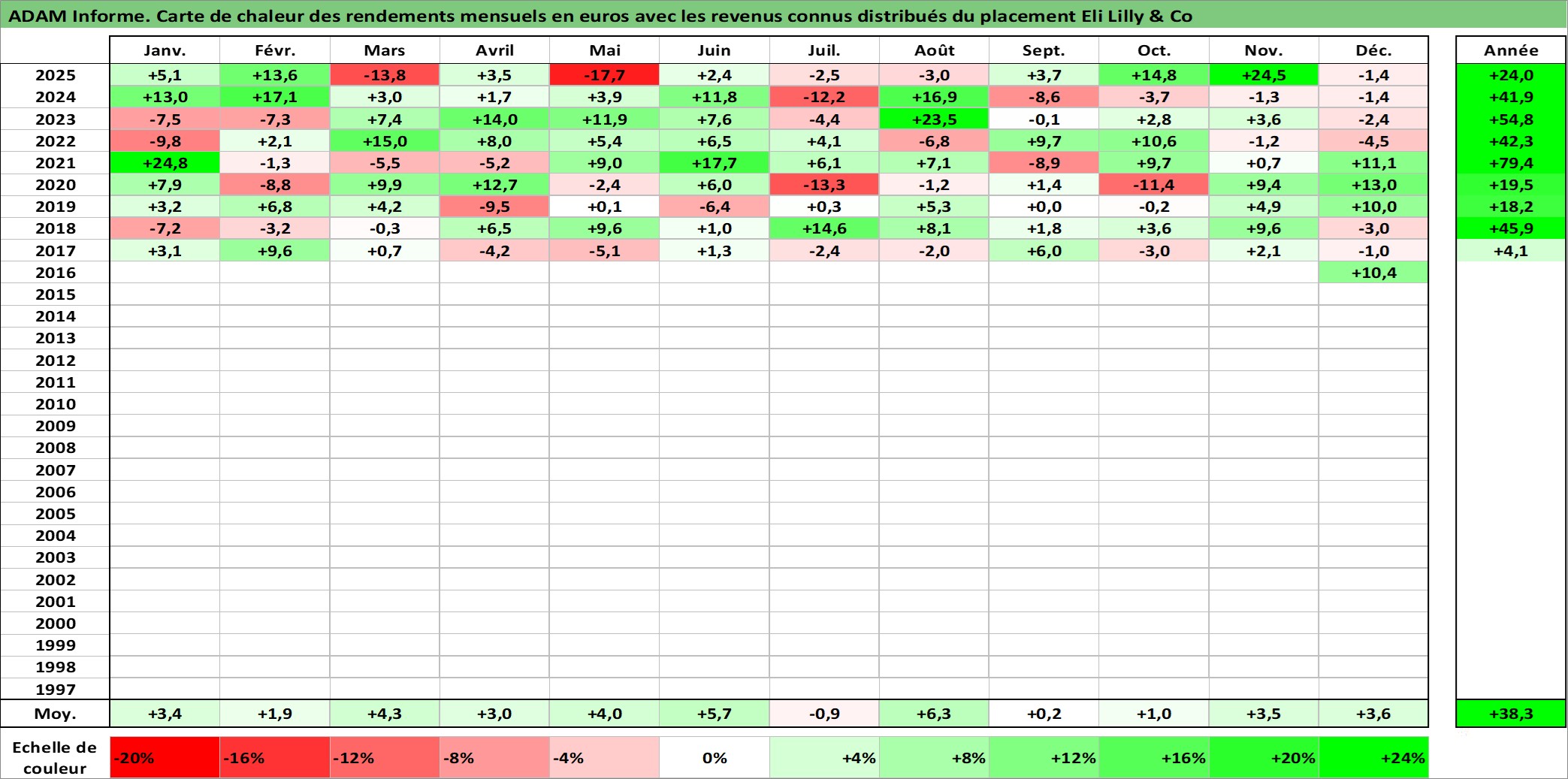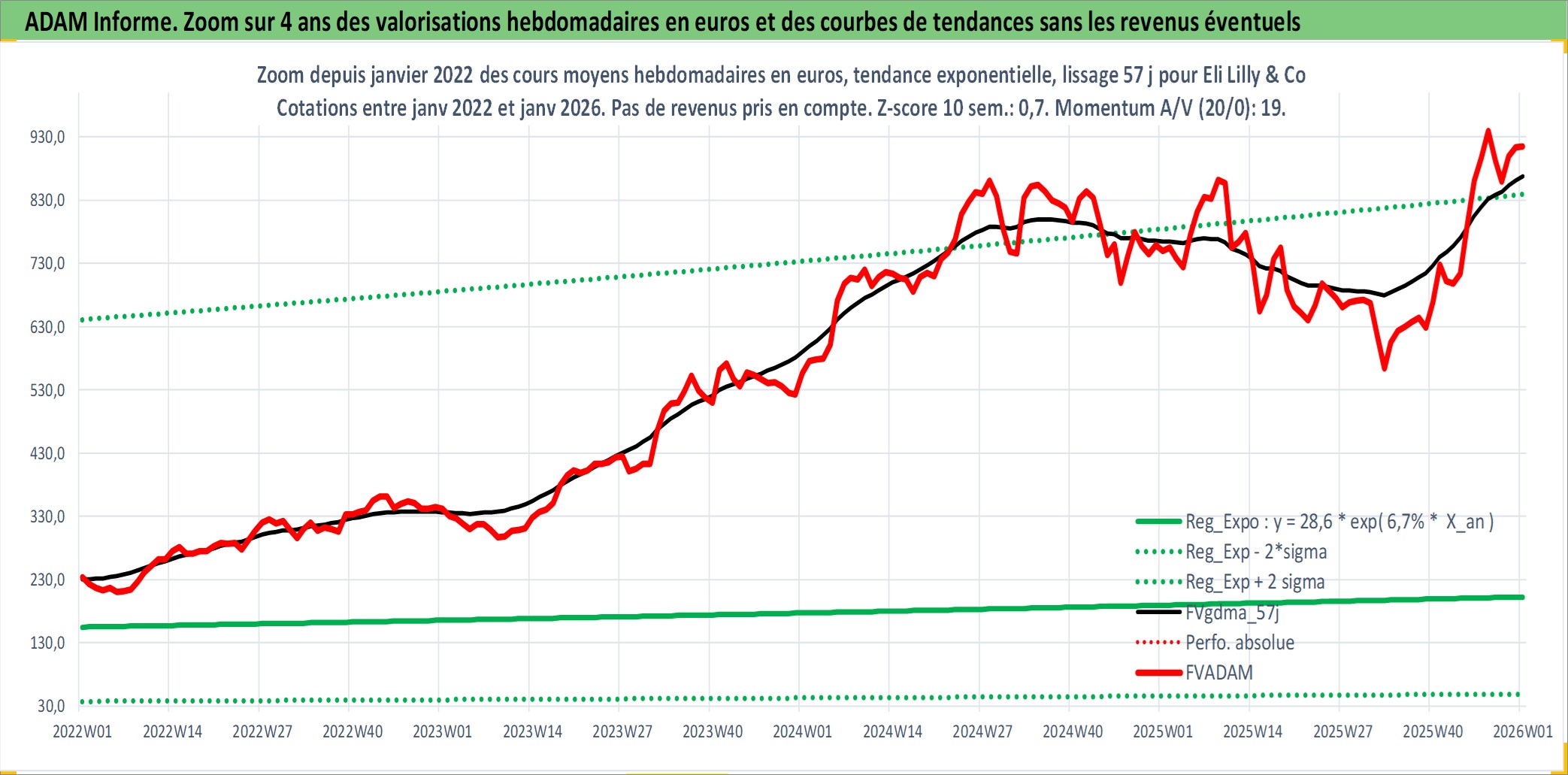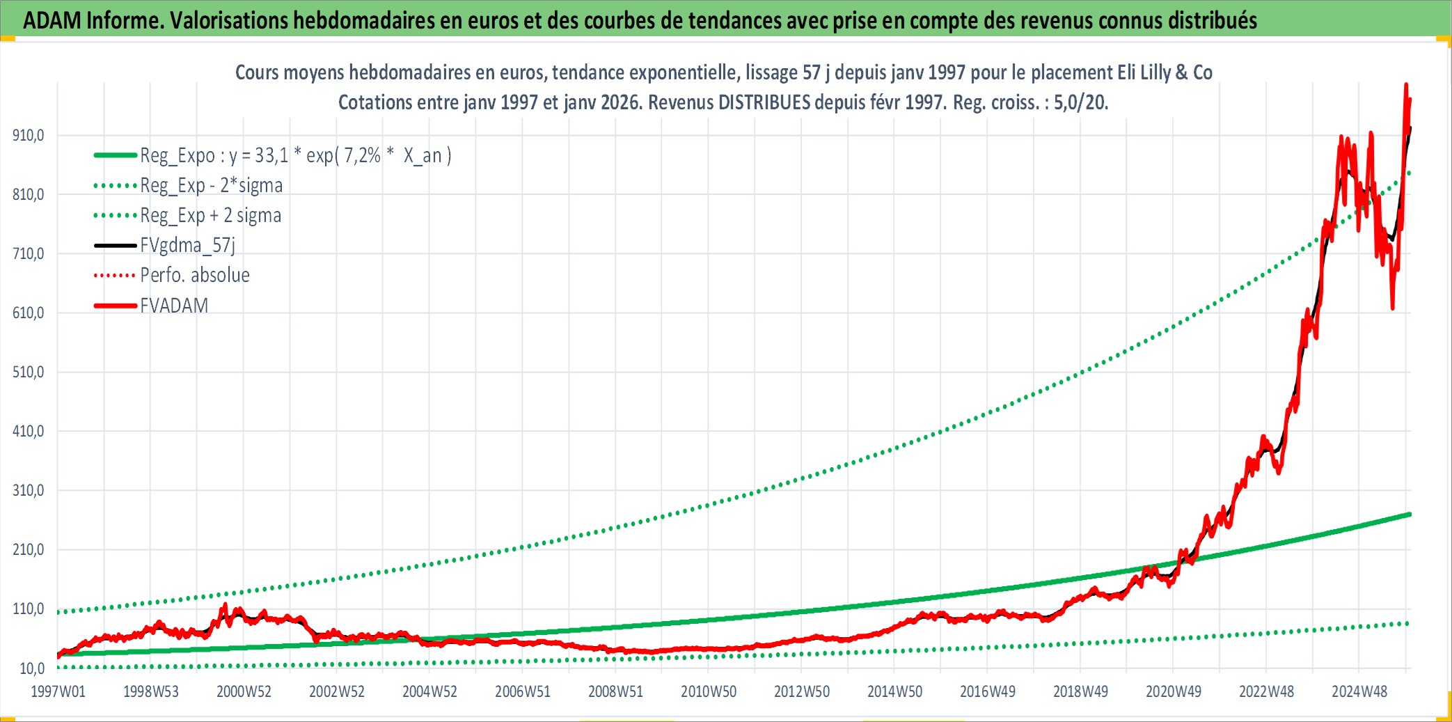 Site dédié aux investisseursPage dédiée sur site financeAnalyse des valorisations hebdomadaires de l'action Eli Lilly & Co. Cet actif est cote en USD. Les valorisations sont en contrevaleur EURO et couvrent les semaines 1997W01 a 2026W01. Les revenus de cet actif financier sont pris en compte depuis la semaine 1997W07. La note globale ESG de cet actif est estimee a 4.0 (apres rebasage entre 0 et 20).