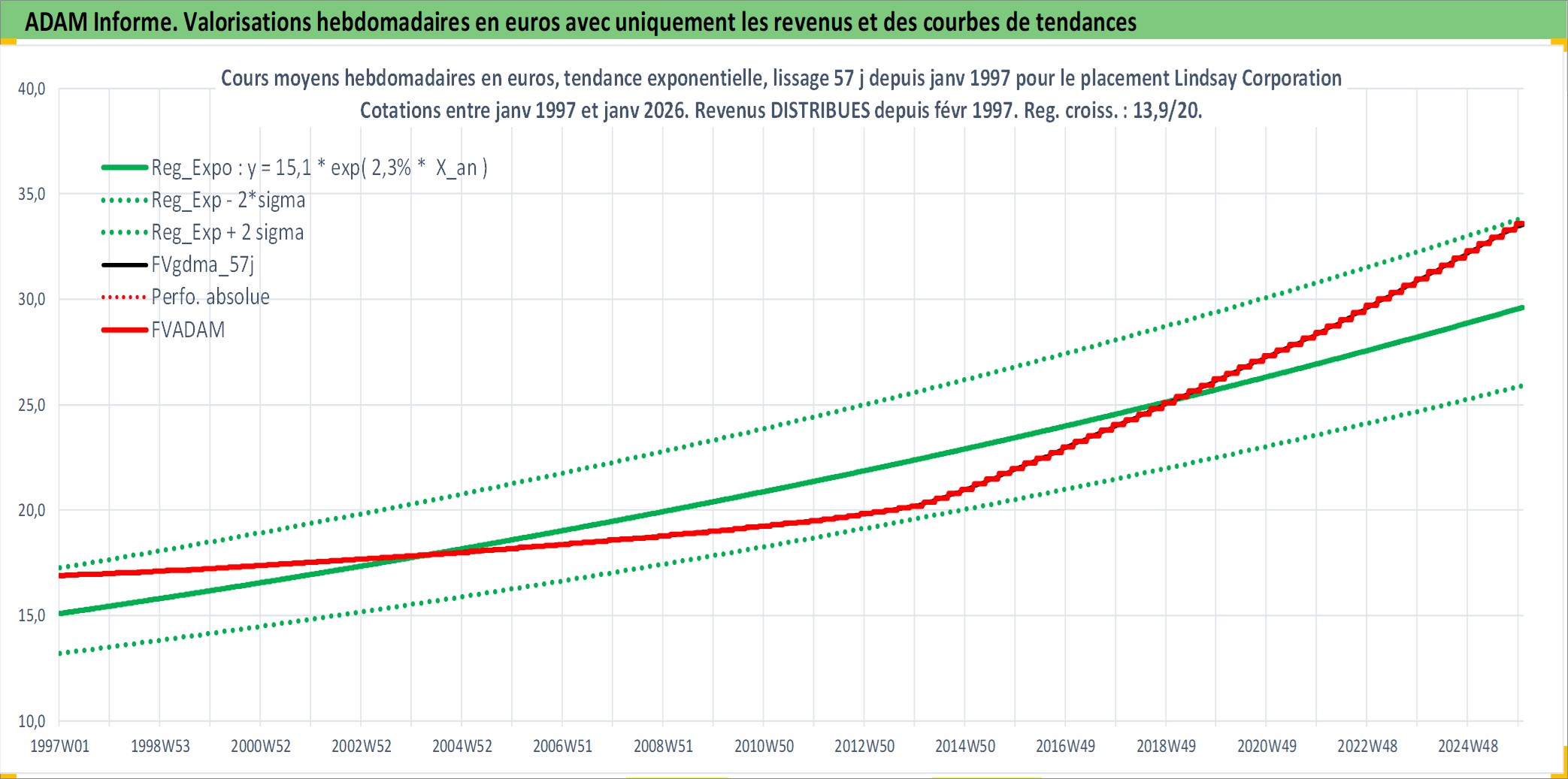 Site dédié aux investisseursPage dédiée sur site financeAnalyse des valorisations hebdomadaires de l'action Lindsay Corporation. Cet actif est cote en USD. Les valorisations sont en contrevaleur EURO et couvrent les semaines 1997W01 a 2026W01. Les revenus de cet actif financier sont pris en compte depuis la semaine 1997W07. La note ESG de cet actif n'est pas connue.