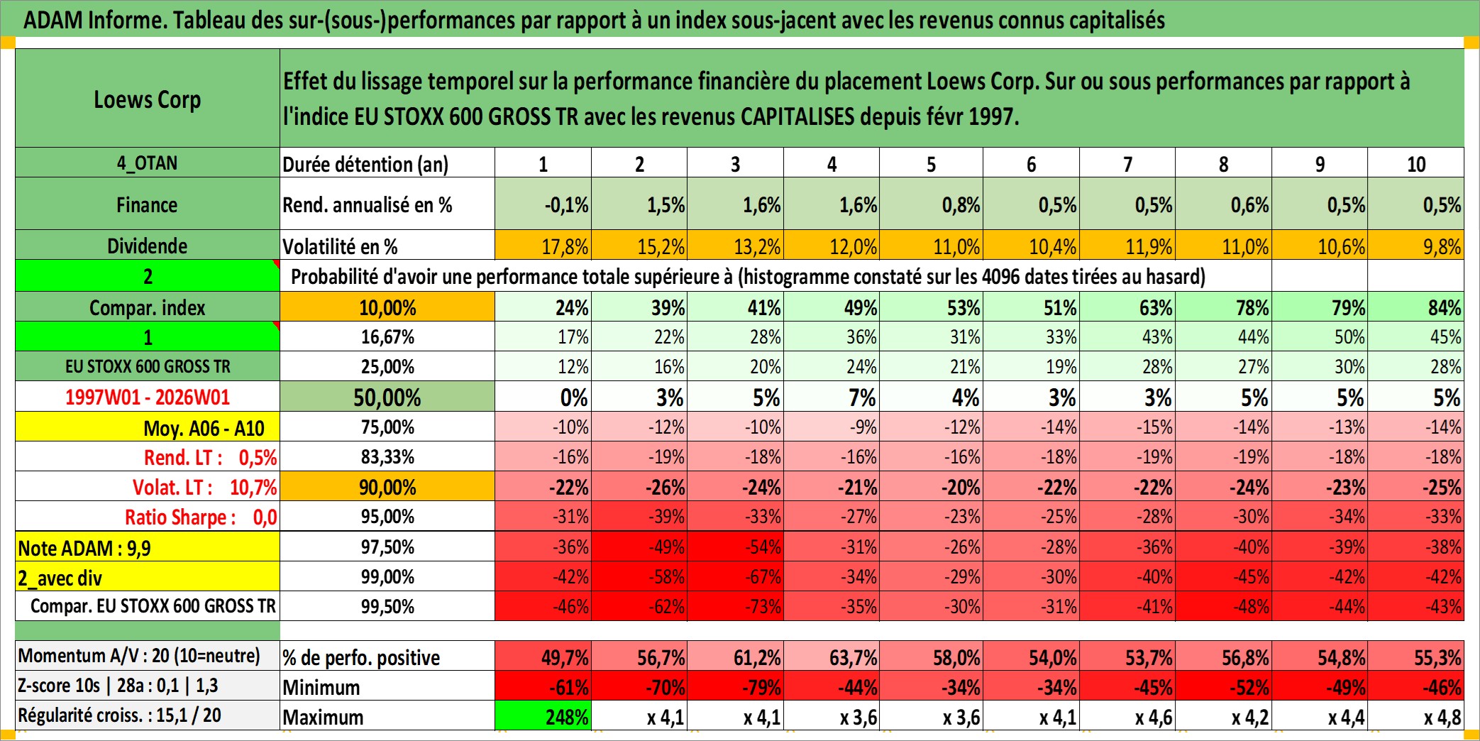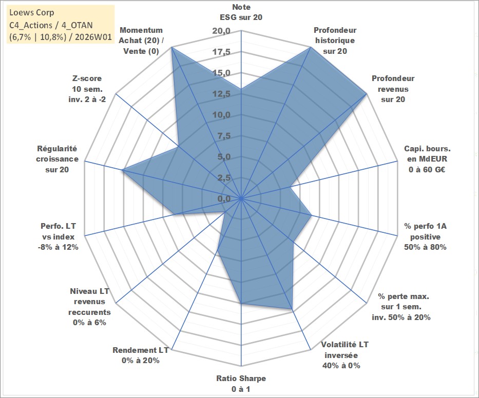 Site dédié aux investisseursPage dédiée sur site financeAnalyse des valorisations hebdomadaires de l'action Loews Corp. Cet actif est cote en USD. Les valorisations sont en contrevaleur EURO et couvrent les semaines 1997W01 a 2026W01. Les revenus de cet actif financier sont pris en compte depuis la semaine 1997W06. La note globale ESG de cet actif est estimee a 13.0 (apres rebasage entre 0 et 20).
