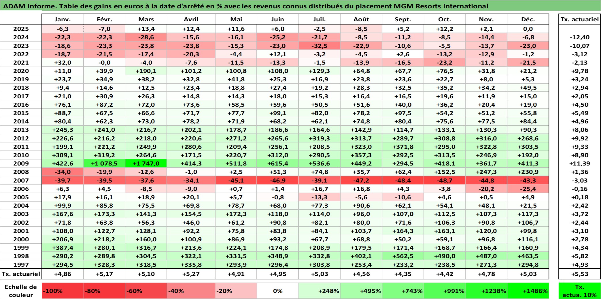 Site dédié aux investisseursPage dédiée sur site financeAnalyse des valorisations hebdomadaires de l'action MGM Resorts International. Cet actif est cote en USD. Les valorisations sont en contrevaleur EURO et couvrent les semaines 1997W01 a 2026W01. Les revenus de cet actif financier sont pris en compte depuis la semaine 2000W06. La note globale ESG de cet actif est estimee a 7.0 (apres rebasage entre 0 et 20).