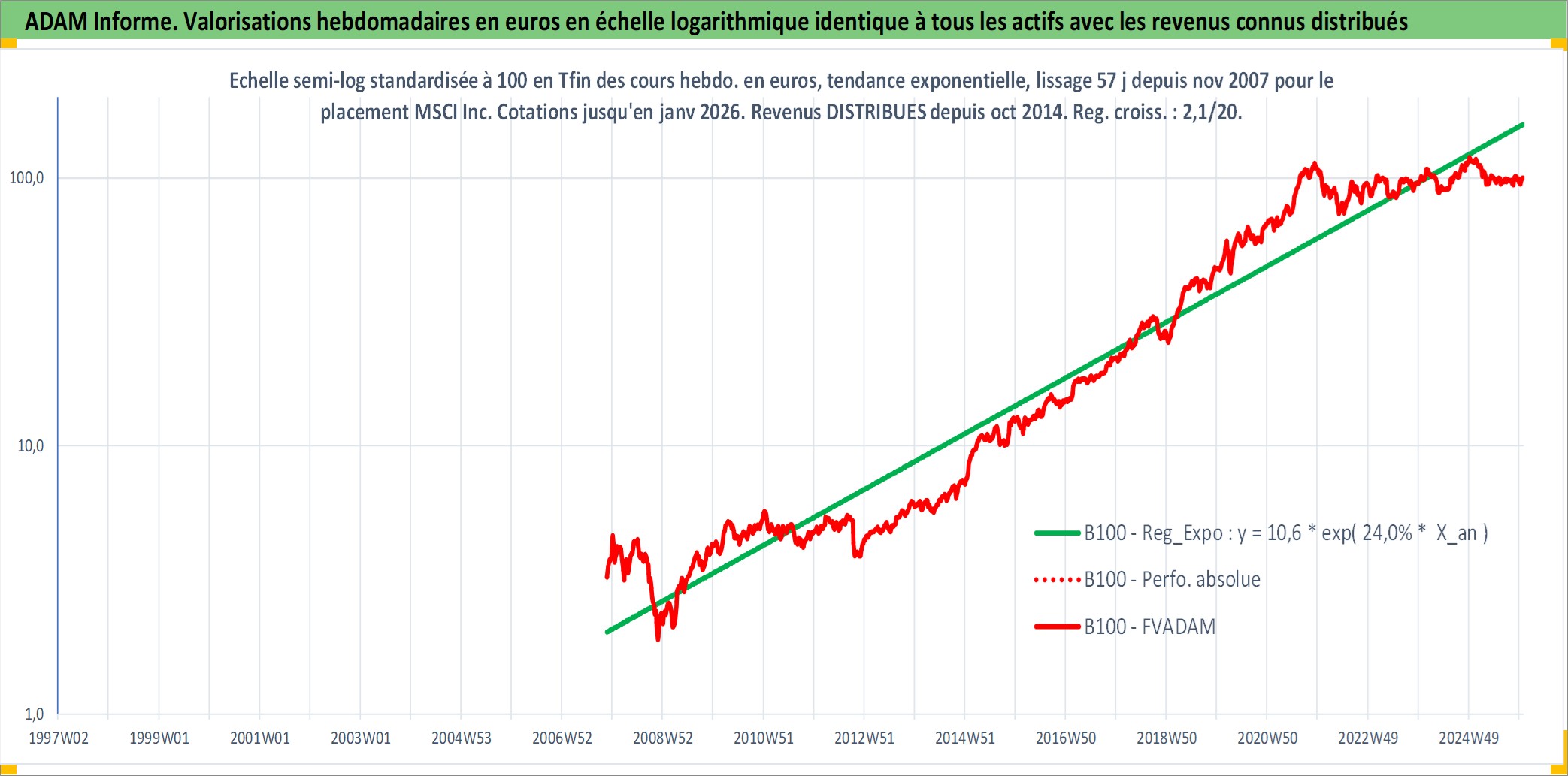 Site dédié aux investisseursPage dédiée sur site financeAnalyse des valorisations hebdomadaires de l'action MSCI Inc. Cet actif est cote en USD. Les valorisations sont en contrevaleur EURO et couvrent les semaines 2007W46 a 2026W01. Les revenus de cet actif financier sont pris en compte depuis la semaine 2014W41. La note globale ESG de cet actif est estimee a 13.0 (apres rebasage entre 0 et 20).