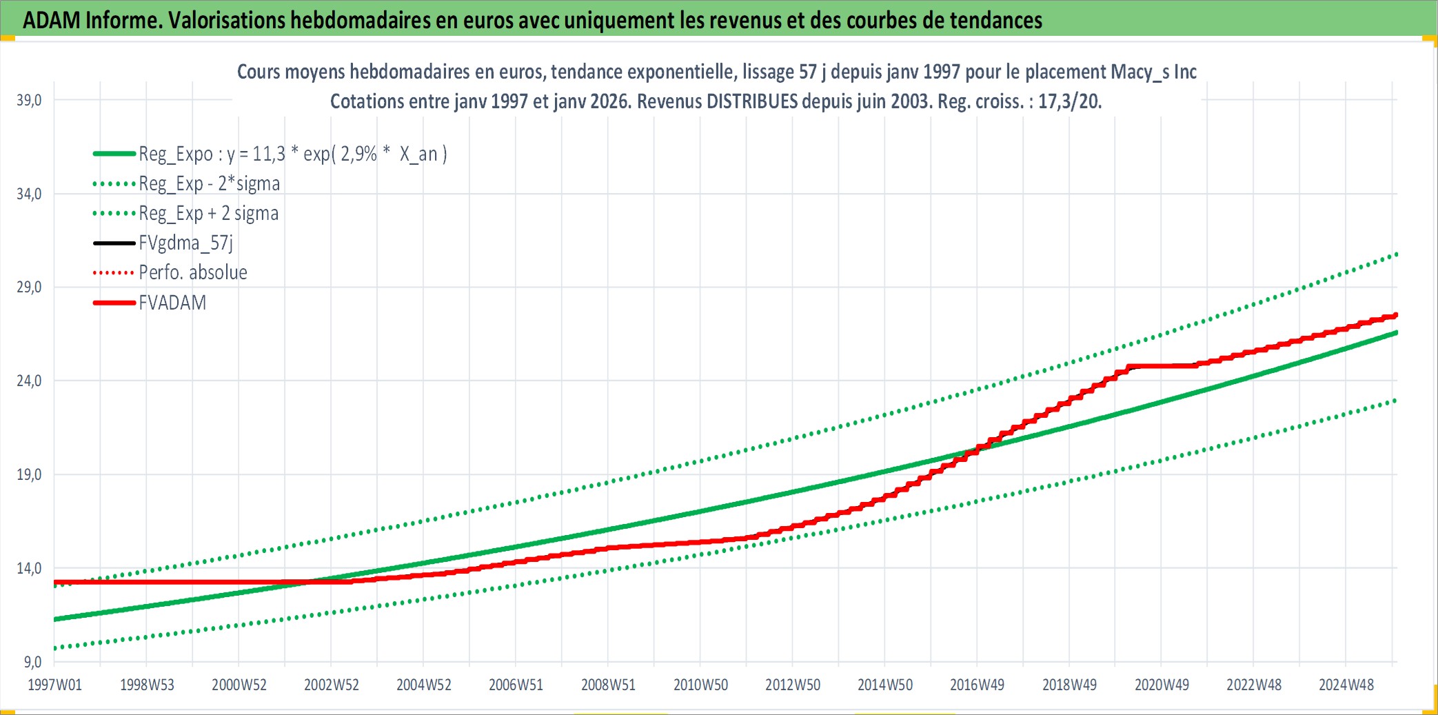 Site dédié aux investisseursPage dédiée sur site financeAnalyse des valorisations hebdomadaires de l'action Macy_s Inc. Cet actif est cote en USD. Les valorisations sont en contrevaleur EURO et couvrent les semaines 1997W01 a 2026W01. Les revenus de cet actif financier sont pris en compte depuis la semaine 2003W24. La note globale ESG de cet actif est estimee a 12.0 (apres rebasage entre 0 et 20).