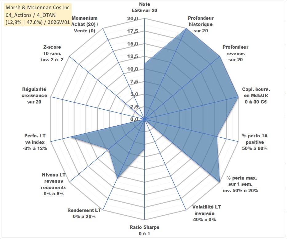Site dédié aux investisseursPage dédiée sur site financeAnalyse des valorisations hebdomadaires de l'action Marsh & McLennan Cos Inc. Cet actif est cote en USD. Les valorisations sont en contrevaleur EURO et couvrent les semaines 1997W01 a 2026W01. Les revenus de cet actif financier sont pris en compte depuis la semaine 1997W02. La note globale ESG de cet actif est estimee a 11.0 (apres rebasage entre 0 et 20).