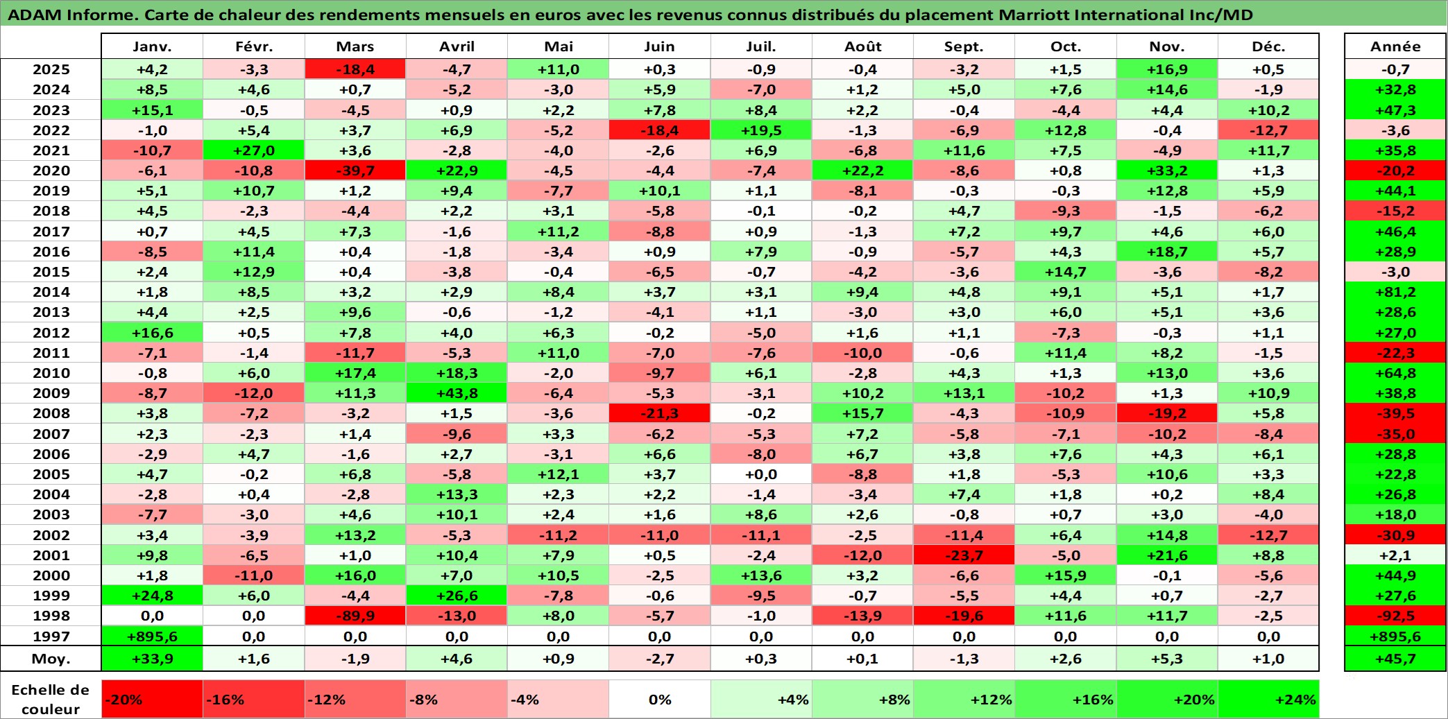 Site dédié aux investisseursPage dédiée sur site financeAnalyse des valorisations hebdomadaires de l'action Marriott International Inc/MD. Cet actif est cote en USD. Les valorisations sont en contrevaleur EURO et couvrent les semaines 1998W13 a 2026W01. Les revenus de cet actif financier sont pris en compte depuis la semaine 1998W16. La note globale ESG de cet actif est estimee a 9.0 (apres rebasage entre 0 et 20).