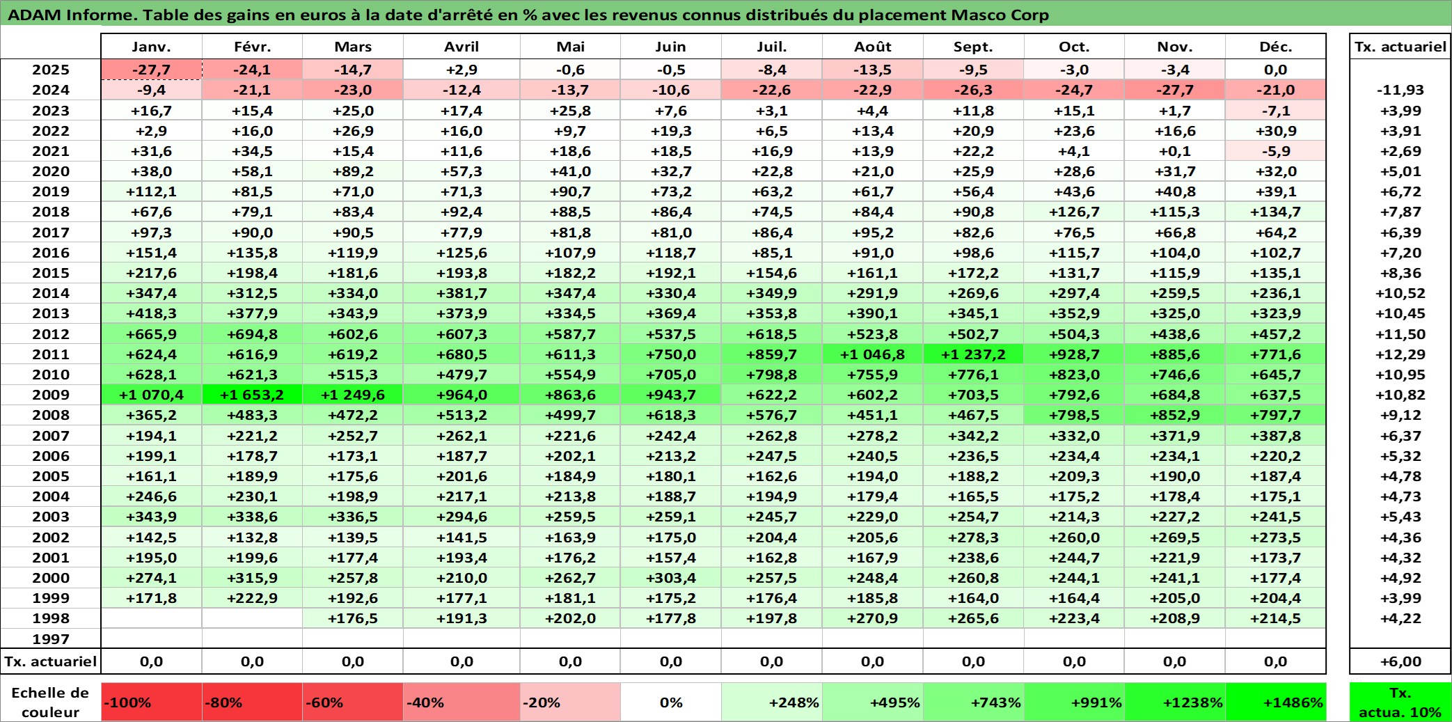 Site dédié aux investisseursPage dédiée sur site financeAnalyse des valorisations hebdomadaires de l'action Masco Corp. Cet actif est cote en USD. Les valorisations sont en contrevaleur EURO et couvrent les semaines 1997W01 a 2026W01. Les revenus de cet actif financier sont pris en compte depuis la semaine 1997W14. La note globale ESG de cet actif est estimee a 9.0 (apres rebasage entre 0 et 20).