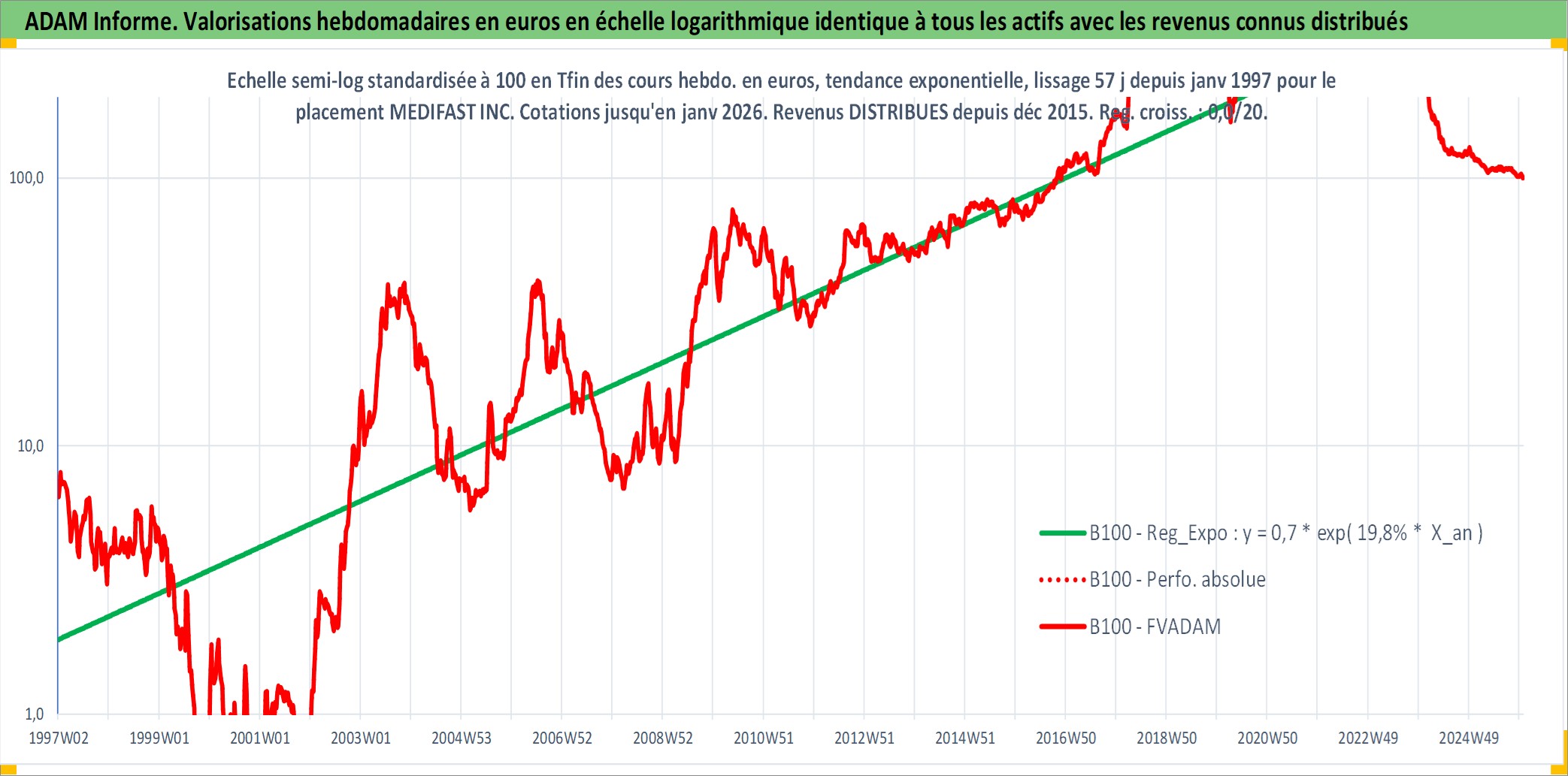 Site dédié aux investisseursPage dédiée sur site financeAnalyse des valorisations hebdomadaires de l'action MEDIFAST INC. Cet actif est cote en USD. Les valorisations sont en contrevaleur EURO et couvrent les semaines 1997W01 a 2026W01. Les revenus de cet actif financier sont pris en compte depuis la semaine 2015W52. La note ESG de cet actif n'est pas connue.