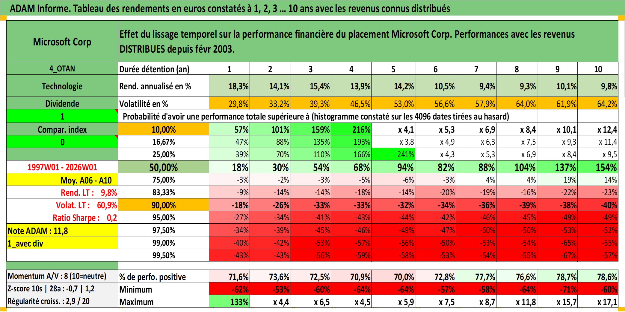 Site dédié aux investisseursPage dédiée sur site financeAnalyse des valorisations hebdomadaires de l'action Microsoft Corp. Cet actif est cote en USD. Les valorisations sont en contrevaleur EURO et couvrent les semaines 1997W01 a 2026W01. Les revenus de cet actif financier sont pris en compte depuis la semaine 2003W08. La note globale ESG de cet actif est estimee a 13.0 (apres rebasage entre 0 et 20).