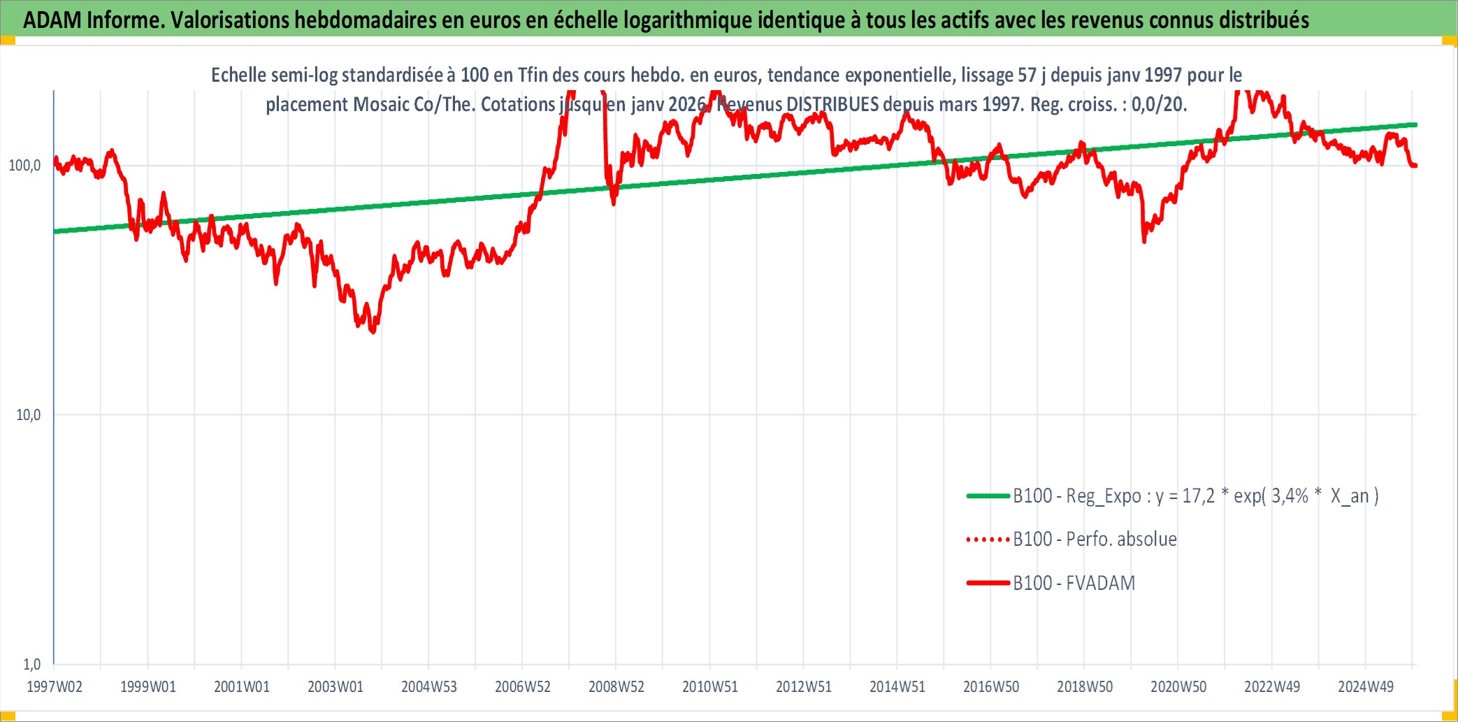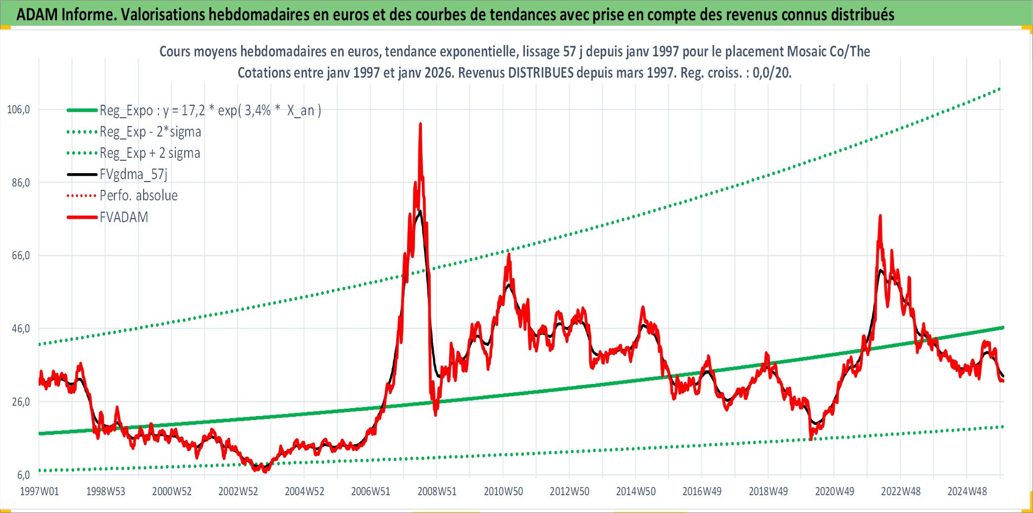 Site dédié aux investisseursPage dédiée sur site financeAnalyse des valorisations hebdomadaires de l'action Mosaic Co/The. Cet actif est cote en USD. Les valorisations sont en contrevaleur EURO et couvrent les semaines 1997W01 a 2026W01. Les revenus de cet actif financier sont pris en compte depuis la semaine 1997W11. La note globale ESG de cet actif est estimee a 4.0 (apres rebasage entre 0 et 20).