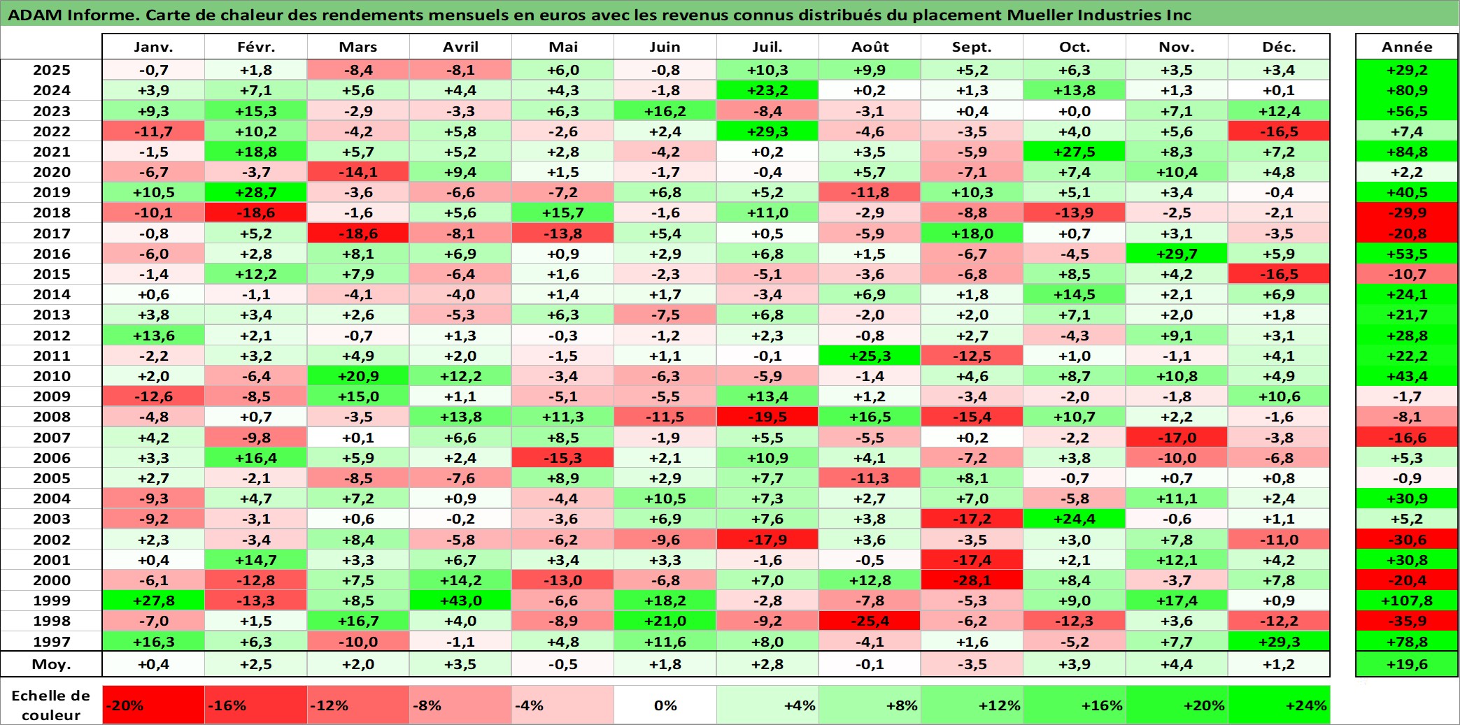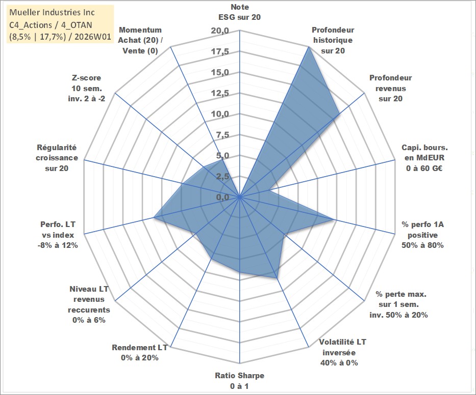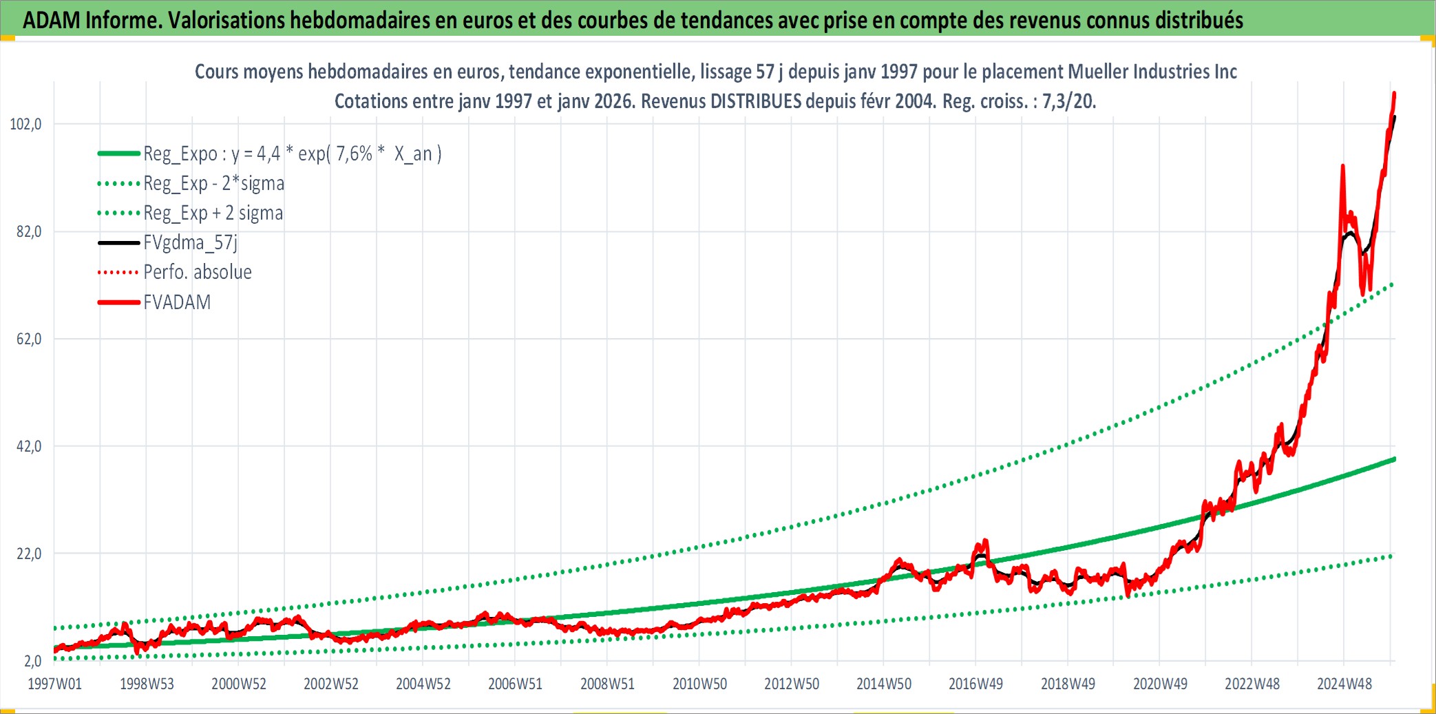 Site dédié aux investisseursPage dédiée sur site financeAnalyse des valorisations hebdomadaires de l'action Mueller Industries Inc. Cet actif est cote en USD. Les valorisations sont en contrevaleur EURO et couvrent les semaines 1997W01 a 2026W01. Les revenus de cet actif financier sont pris en compte depuis la semaine 2004W09. La note ESG de cet actif n'est pas connue.