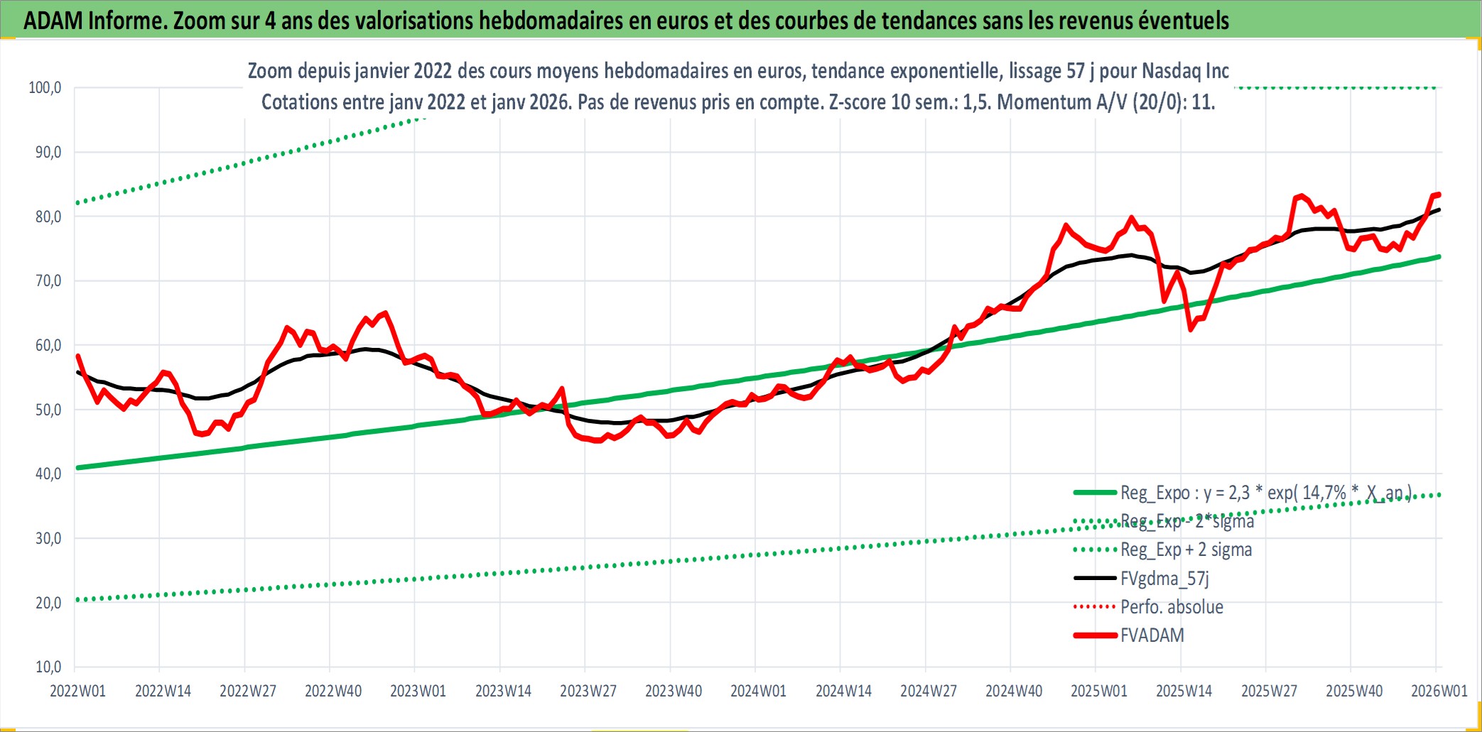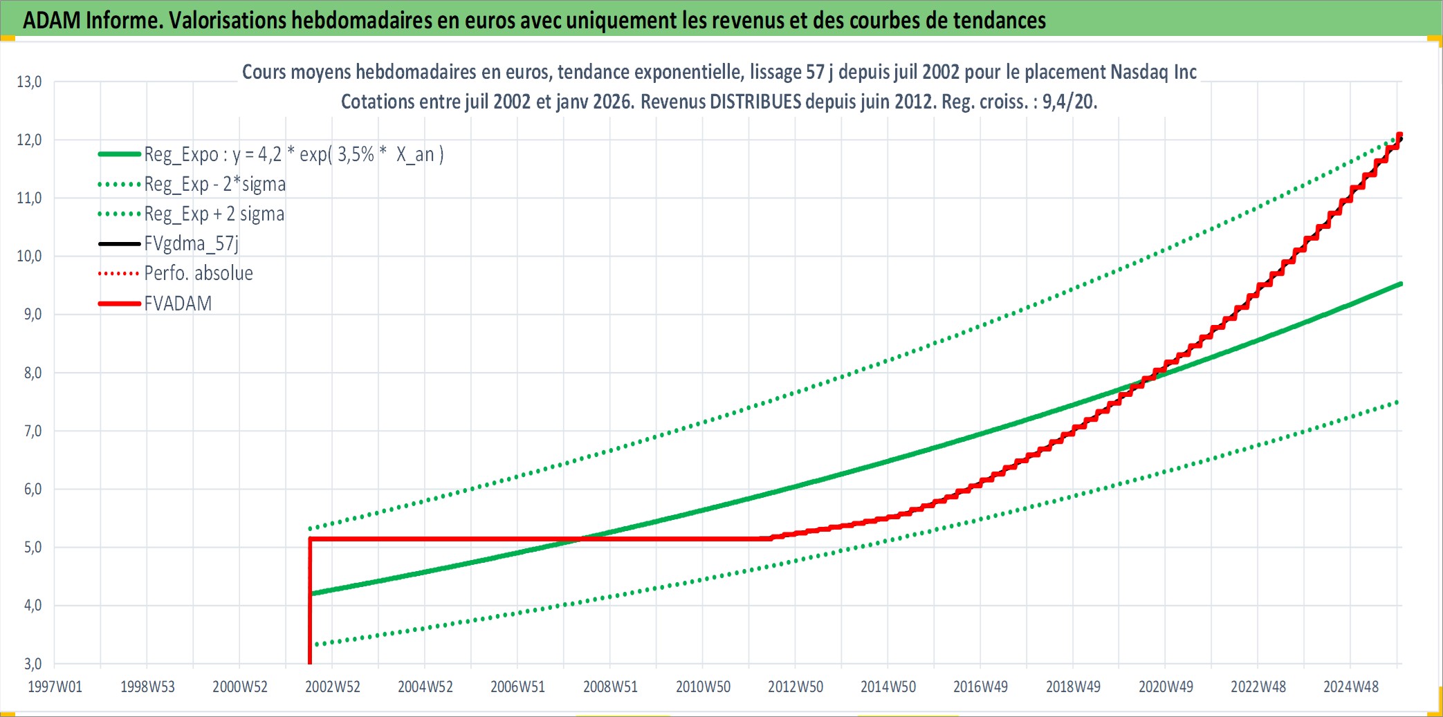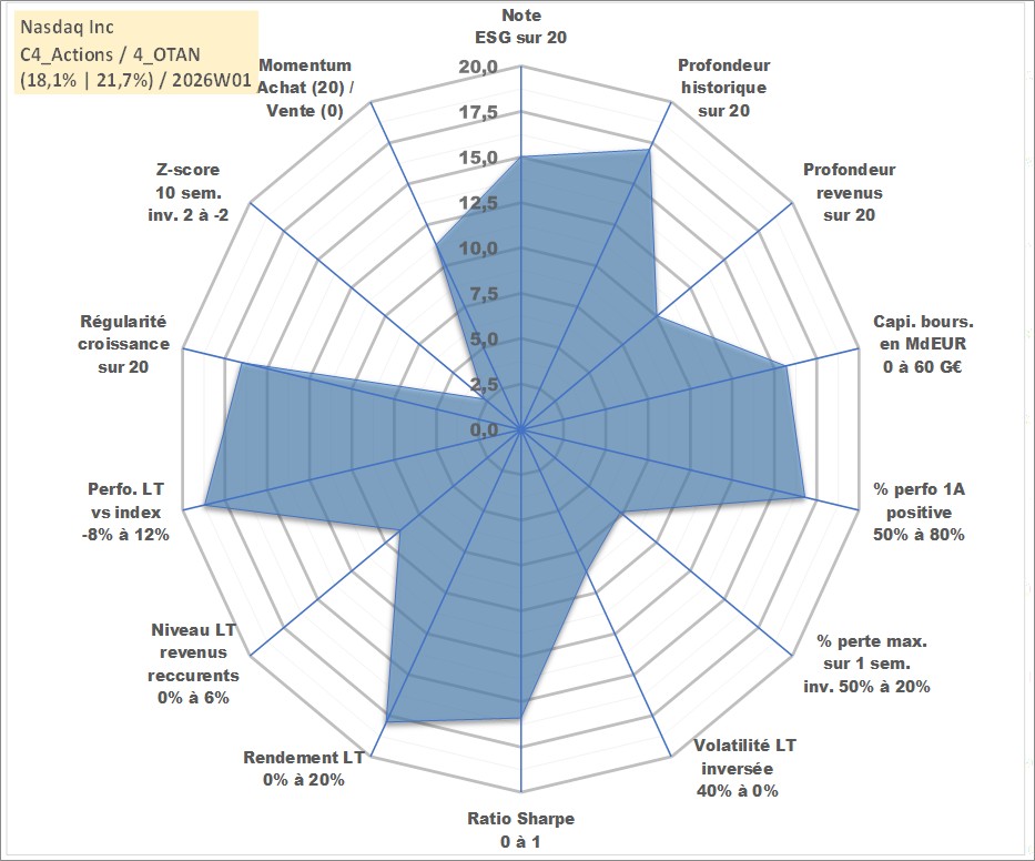 Site dédié aux investisseursPage dédiée sur site financeAnalyse des valorisations hebdomadaires de l'action Nasdaq Inc. Cet actif est cote en USD. Les valorisations sont en contrevaleur EURO et couvrent les semaines 2002W27 a 2026W01. Les revenus de cet actif financier sont pris en compte depuis la semaine 2012W24. La note globale ESG de cet actif est estimee a 15.0 (apres rebasage entre 0 et 20).