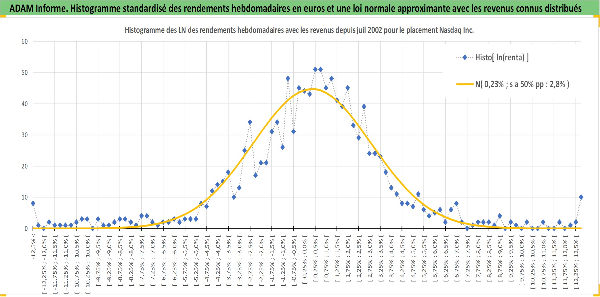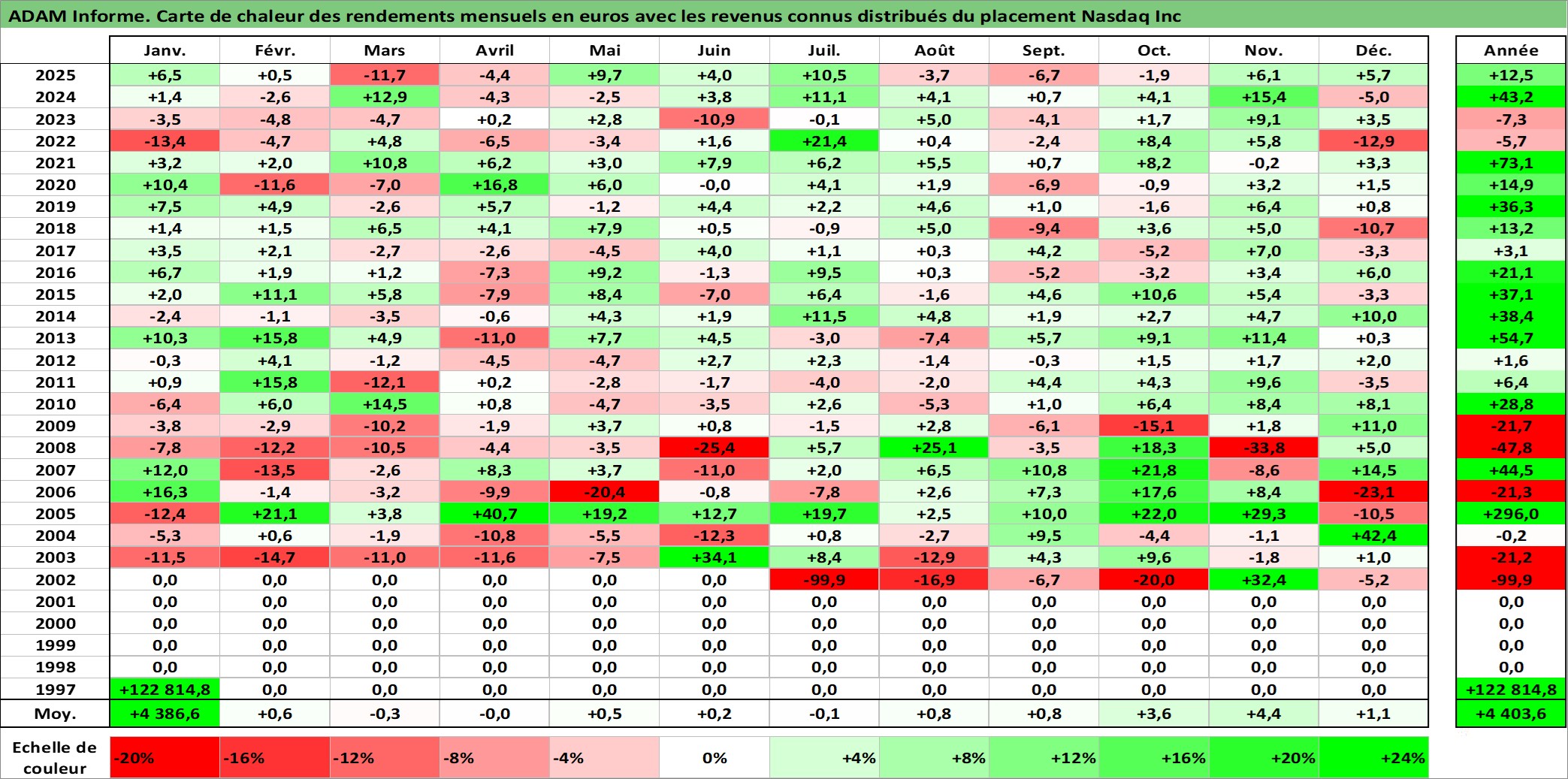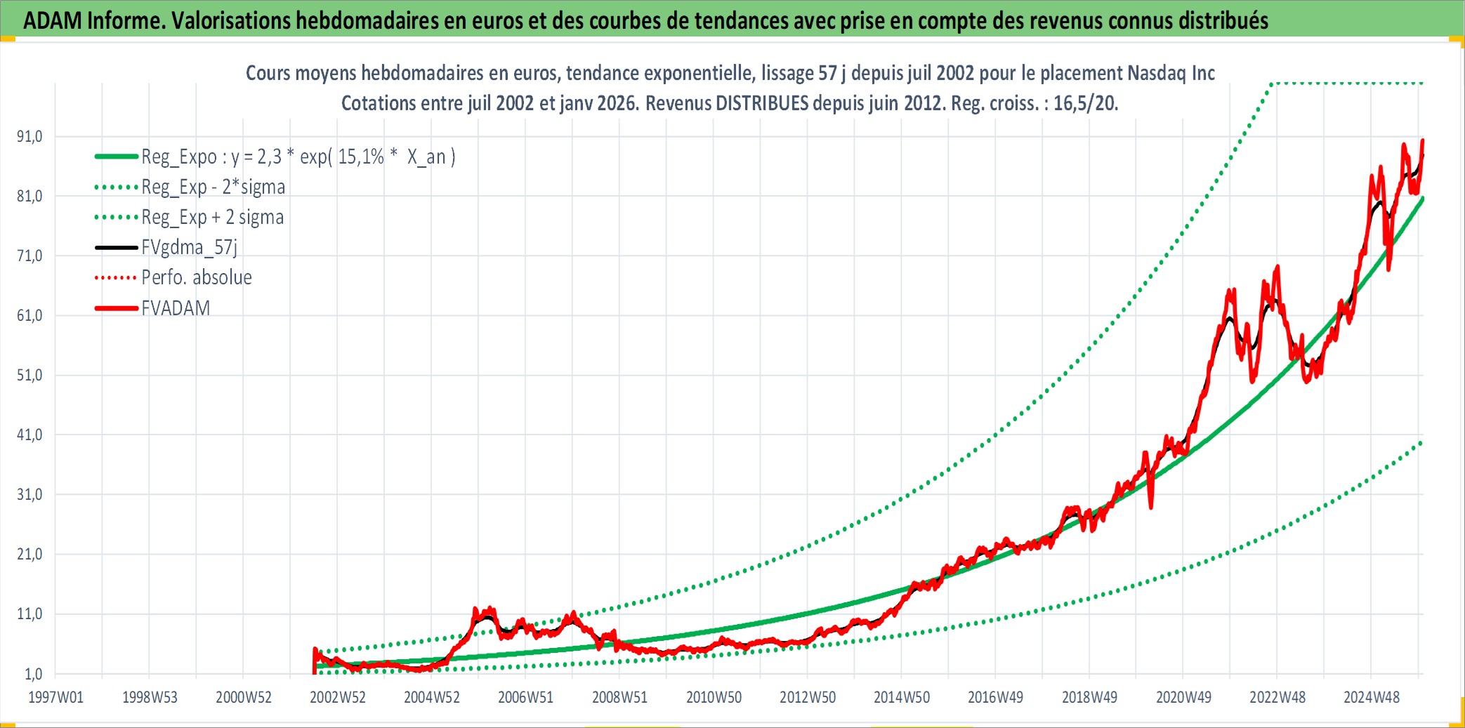 Site dédié aux investisseursPage dédiée sur site financeAnalyse des valorisations hebdomadaires de l'action Nasdaq Inc. Cet actif est cote en USD. Les valorisations sont en contrevaleur EURO et couvrent les semaines 2002W27 a 2026W01. Les revenus de cet actif financier sont pris en compte depuis la semaine 2012W24. La note globale ESG de cet actif est estimee a 15.0 (apres rebasage entre 0 et 20).