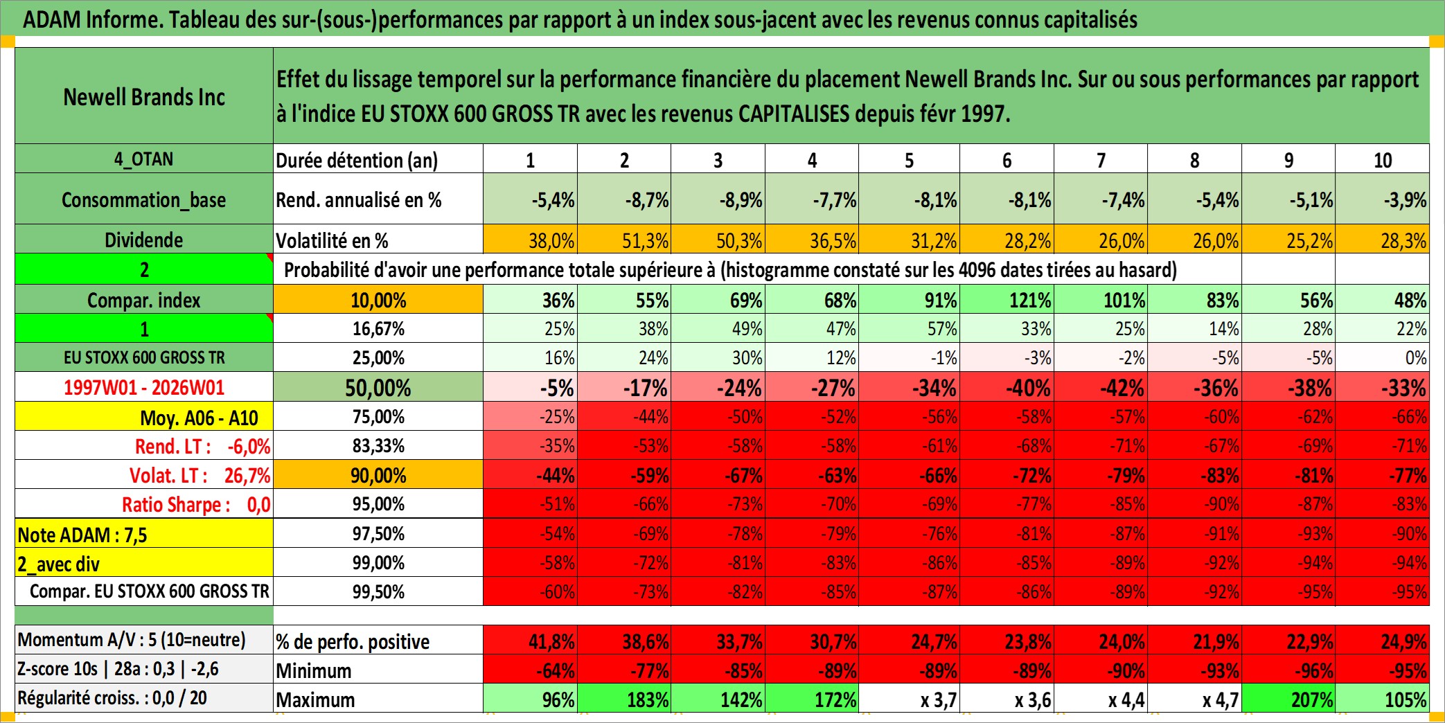 Site dédié aux investisseursPage dédiée sur site financeAnalyse des valorisations hebdomadaires de l'action Newell Brands Inc. Cet actif est cote en USD. Les valorisations sont en contrevaleur EURO et couvrent les semaines 1997W01 a 2026W01. Les revenus de cet actif financier sont pris en compte depuis la semaine 1997W08. La note globale ESG de cet actif est estimee a 14.0 (apres rebasage entre 0 et 20).
