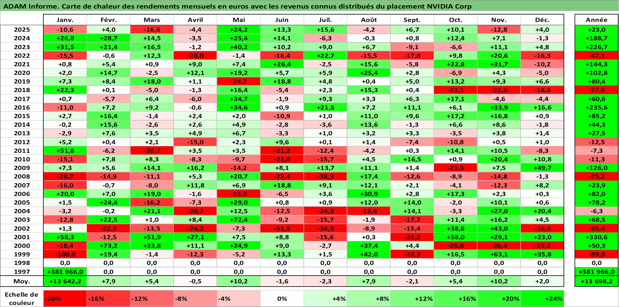 Site dédié aux investisseursPage dédiée sur site financeAnalyse des valorisations hebdomadaires de l'action NVIDIA Corp. Cet actif est cote en USD. Les valorisations sont en contrevaleur EURO et couvrent les semaines 1999W03 a 2026W01. Les revenus de cet actif financier sont pris en compte depuis la semaine 2012W47. La note globale ESG de cet actif est estimee a 15.0 (apres rebasage entre 0 et 20).
