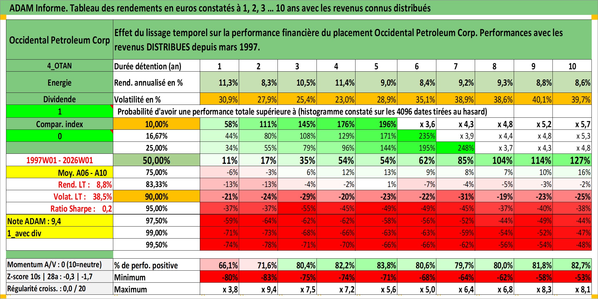 Site dédié aux investisseursPage dédiée sur site financeAnalyse des valorisations hebdomadaires de l'action Occidental Petroleum Corp. Cet actif est cote en USD. Les valorisations sont en contrevaleur EURO et couvrent les semaines 1997W01 a 2026W01. Les revenus de cet actif financier sont pris en compte depuis la semaine 1997W10. La note globale ESG de cet actif est estimee a 1.0 (apres rebasage entre 0 et 20).