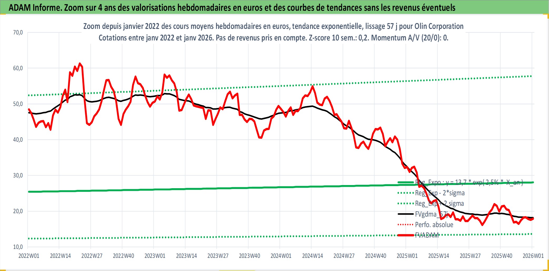 Site dédié aux investisseursPage dédiée sur site financeAnalyse des valorisations hebdomadaires de l'action Olin Corporation. Cet actif est cote en USD. Les valorisations sont en contrevaleur EURO et couvrent les semaines 1997W01 a 2026W01. Les revenus de cet actif financier sont pris en compte depuis la semaine 1997W02. La note ESG de cet actif n'est pas connue.