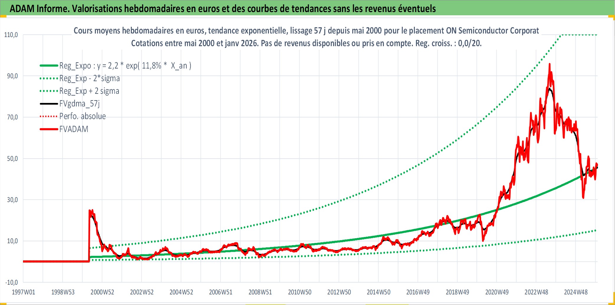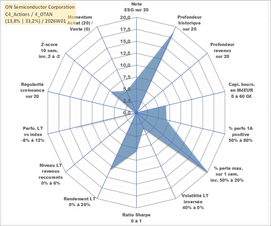 Site dédié aux investisseursPage dédiée sur site financeAnalyse des valorisations hebdomadaires de l'action ON Semiconductor Corporation. Cet actif est cote en USD. Les valorisations sont en contrevaleur EURO et couvrent les semaines 2000W18 a 2026W01. Les revenus de cet actif financier ne sont pas connus car non existants ou non disponibles sur le site Yahoo Finance. La note globale ESG de cet actif est estimee a 7.0 (apres rebasage entre 0 et 20).