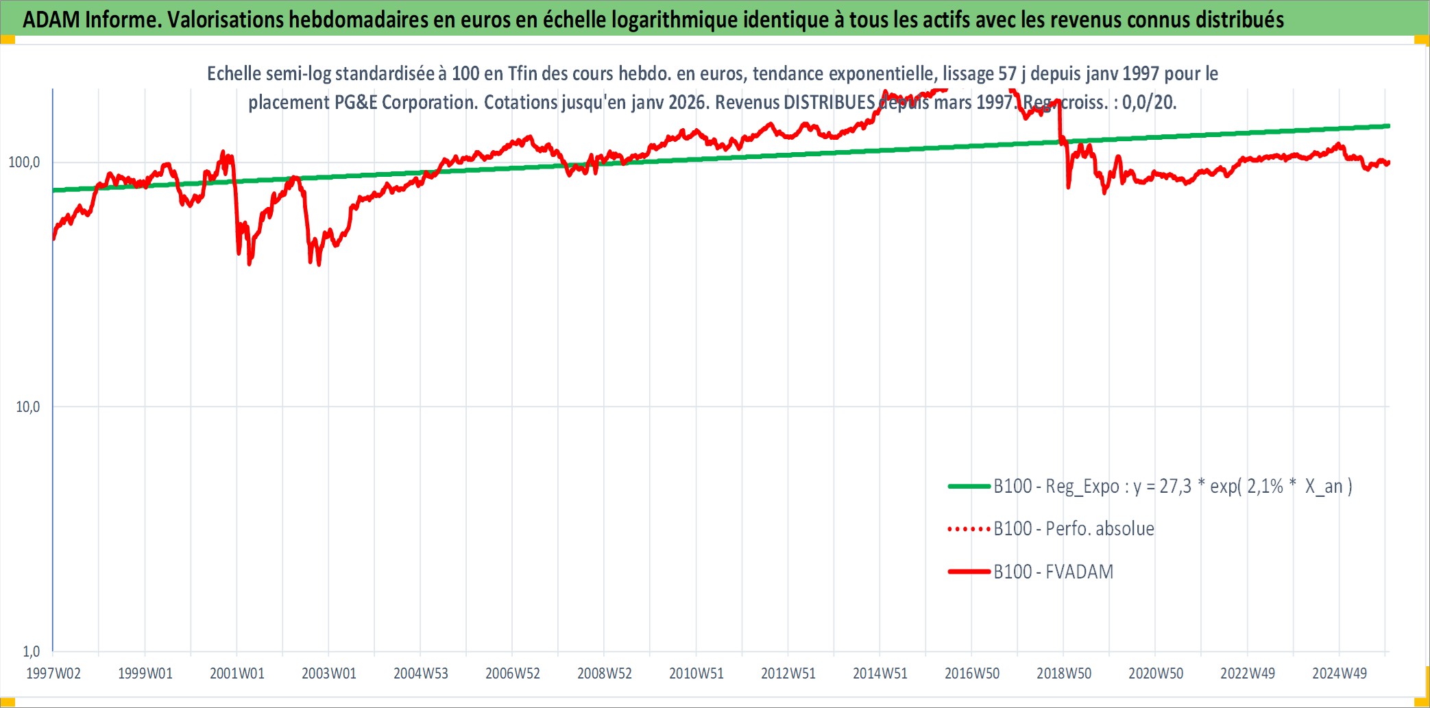 Site dédié aux investisseursPage dédiée sur site financeAnalyse des valorisations hebdomadaires de l'action PG&E Corporation. Cet actif est cote en USD. Les valorisations sont en contrevaleur EURO et couvrent les semaines 1997W01 a 2026W01. Les revenus de cet actif financier sont pris en compte depuis la semaine 1997W11. La note globale ESG de cet actif est estimee a 3.0 (apres rebasage entre 0 et 20).