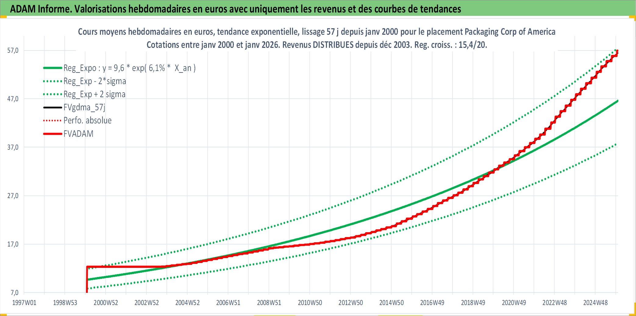 Site dédié aux investisseursPage dédiée sur site financeAnalyse des valorisations hebdomadaires de l'action Packaging Corp of America. Cet actif est cote en USD. Les valorisations sont en contrevaleur EURO et couvrent les semaines 2000W04 a 2026W01. Les revenus de cet actif financier sont pris en compte depuis la semaine 2003W50. La note globale ESG de cet actif est estimee a 12.0 (apres rebasage entre 0 et 20).