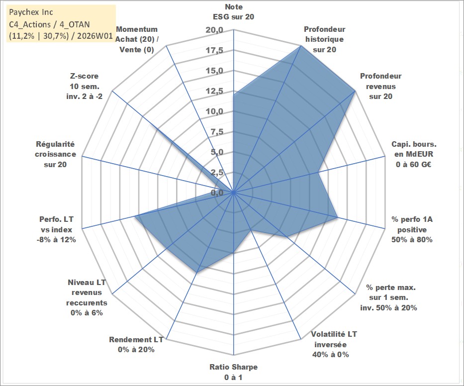 Site dédié aux investisseursPage dédiée sur site financeAnalyse des valorisations hebdomadaires de l'action Paychex Inc. Cet actif est cote en USD. Les valorisations sont en contrevaleur EURO et couvrent les semaines 1997W01 a 2026W01. Les revenus de cet actif financier sont pris en compte depuis la semaine 1997W05. La note globale ESG de cet actif est estimee a 12.0 (apres rebasage entre 0 et 20).