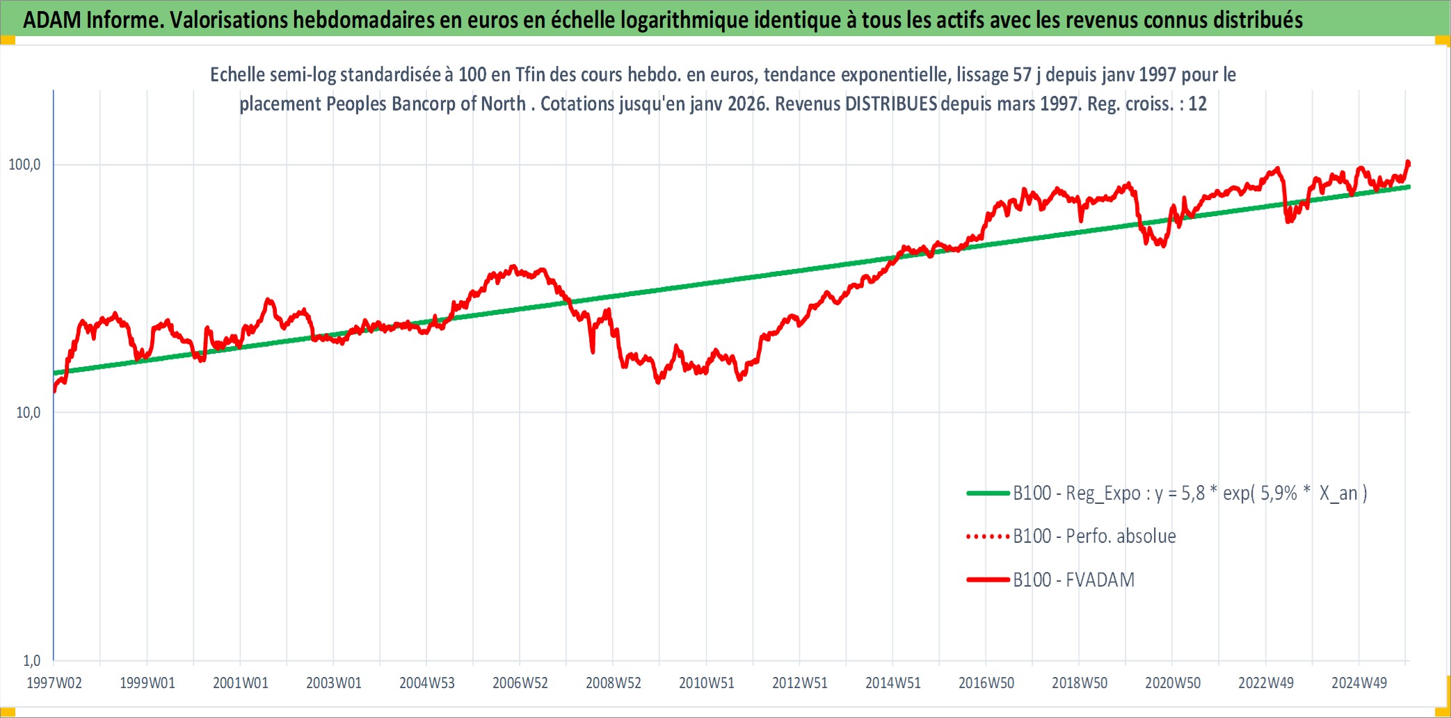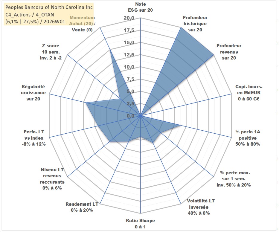 Site dédié aux investisseursPage dédiée sur site financeAnalyse des valorisations hebdomadaires de l'action Peoples Bancorp of North Carolina Inc. Cet actif est cote en USD. Les valorisations sont en contrevaleur EURO et couvrent les semaines 1997W01 a 2026W01. Les revenus de cet actif financier sont pris en compte depuis la semaine 1997W11. La note ESG de cet actif n'est pas connue.