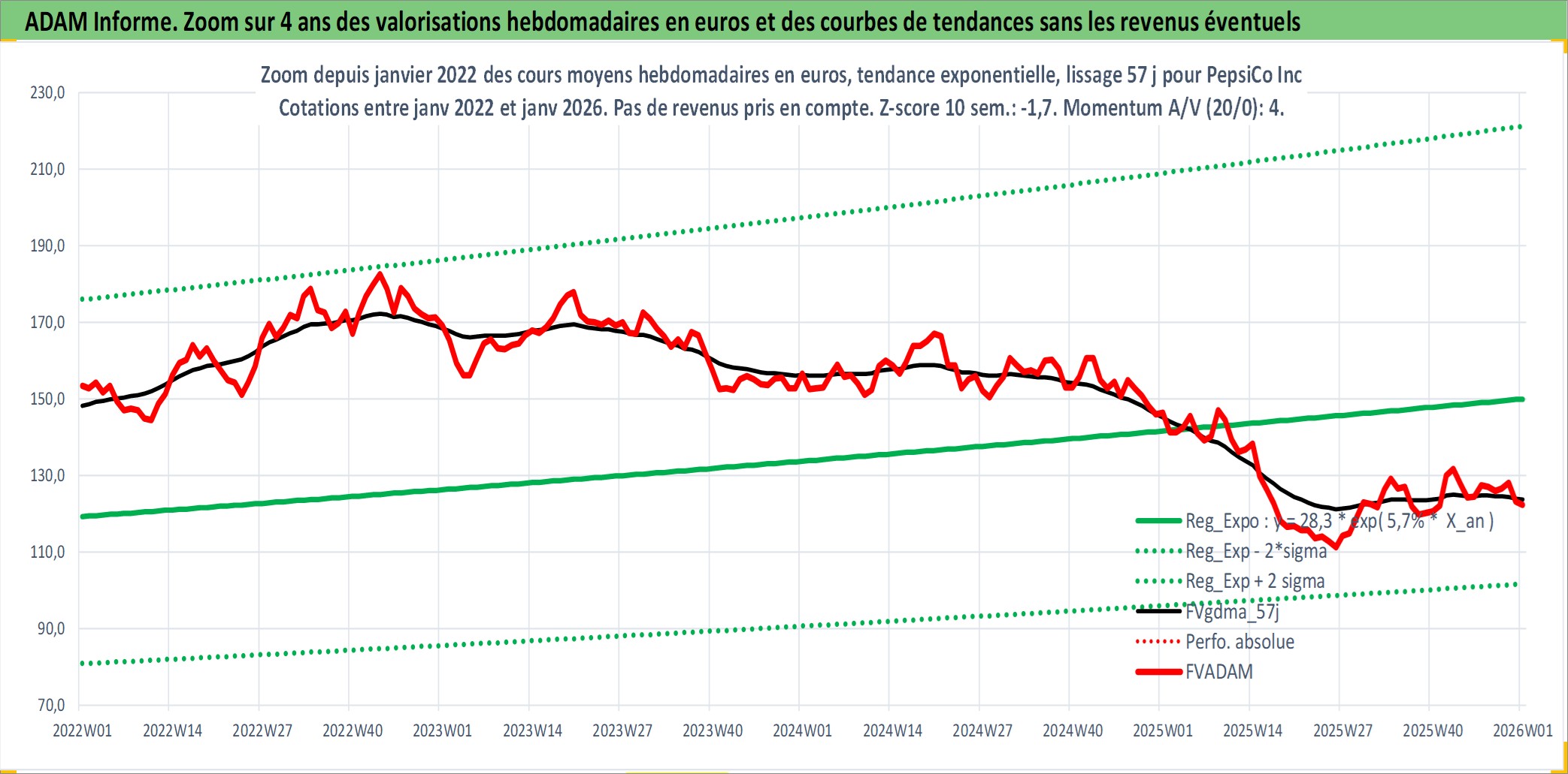 Site dédié aux investisseursPage dédiée sur site financeAnalyse des valorisations hebdomadaires de l'action PepsiCo Inc. Cet actif est cote en USD. Les valorisations sont en contrevaleur EURO et couvrent les semaines 1997W01 a 2026W01. Les revenus de cet actif financier sont pris en compte depuis la semaine 1997W11. La note globale ESG de cet actif est estimee a 13.0 (apres rebasage entre 0 et 20).