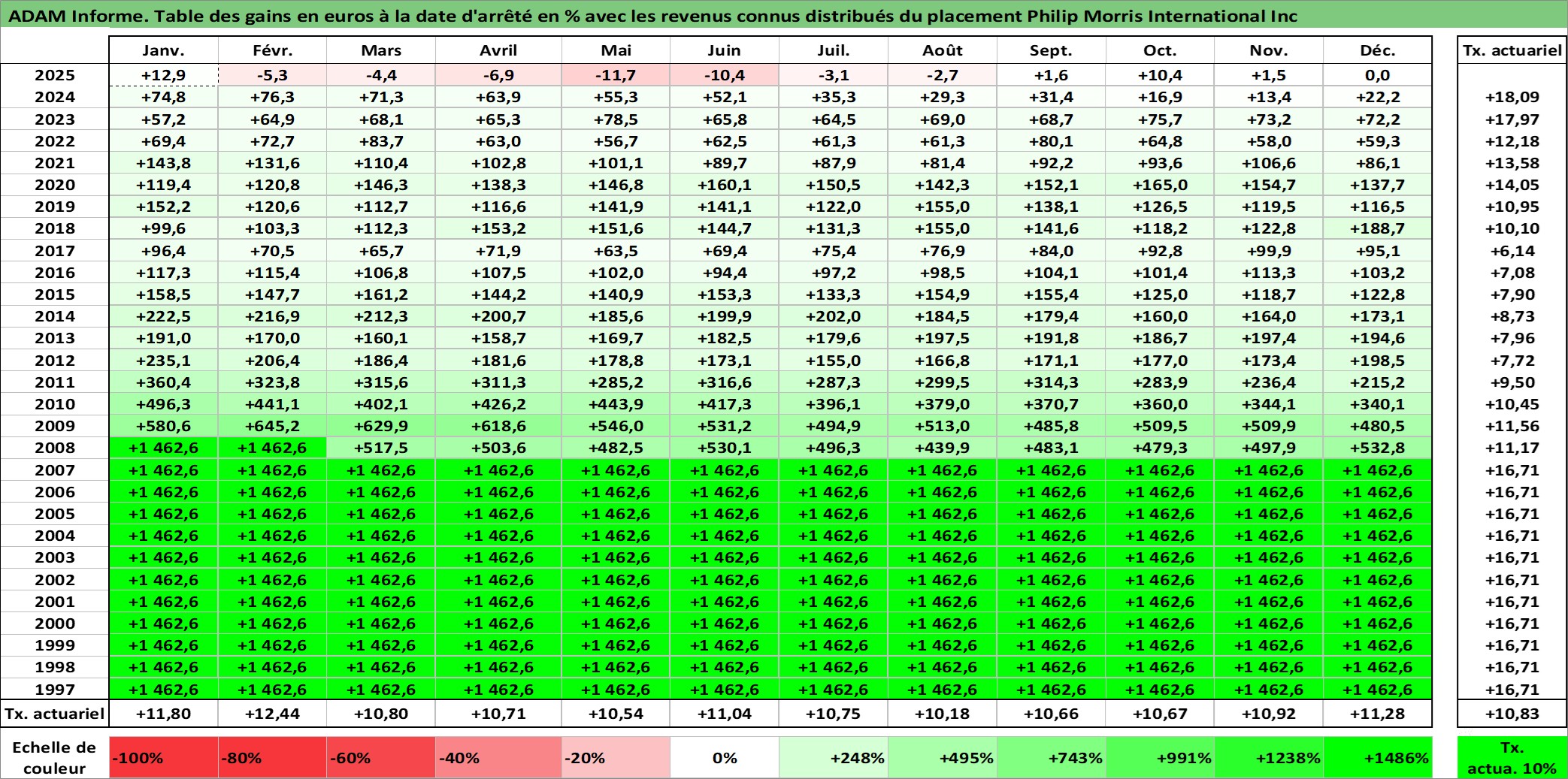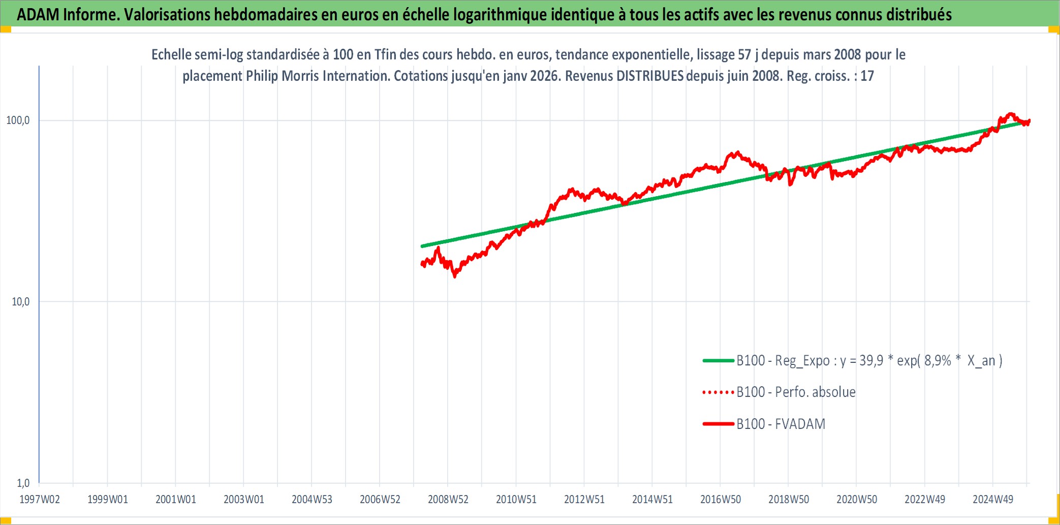 Site dédié aux investisseursPage dédiée sur site financeAnalyse des valorisations hebdomadaires de l'action Philip Morris International Inc. Cet actif est cote en USD. Les valorisations sont en contrevaleur EURO et couvrent les semaines 2008W12 a 2026W01. Les revenus de cet actif financier sont pris en compte depuis la semaine 2008W26. La note globale ESG de cet actif est estimee a 8.0 (apres rebasage entre 0 et 20).
