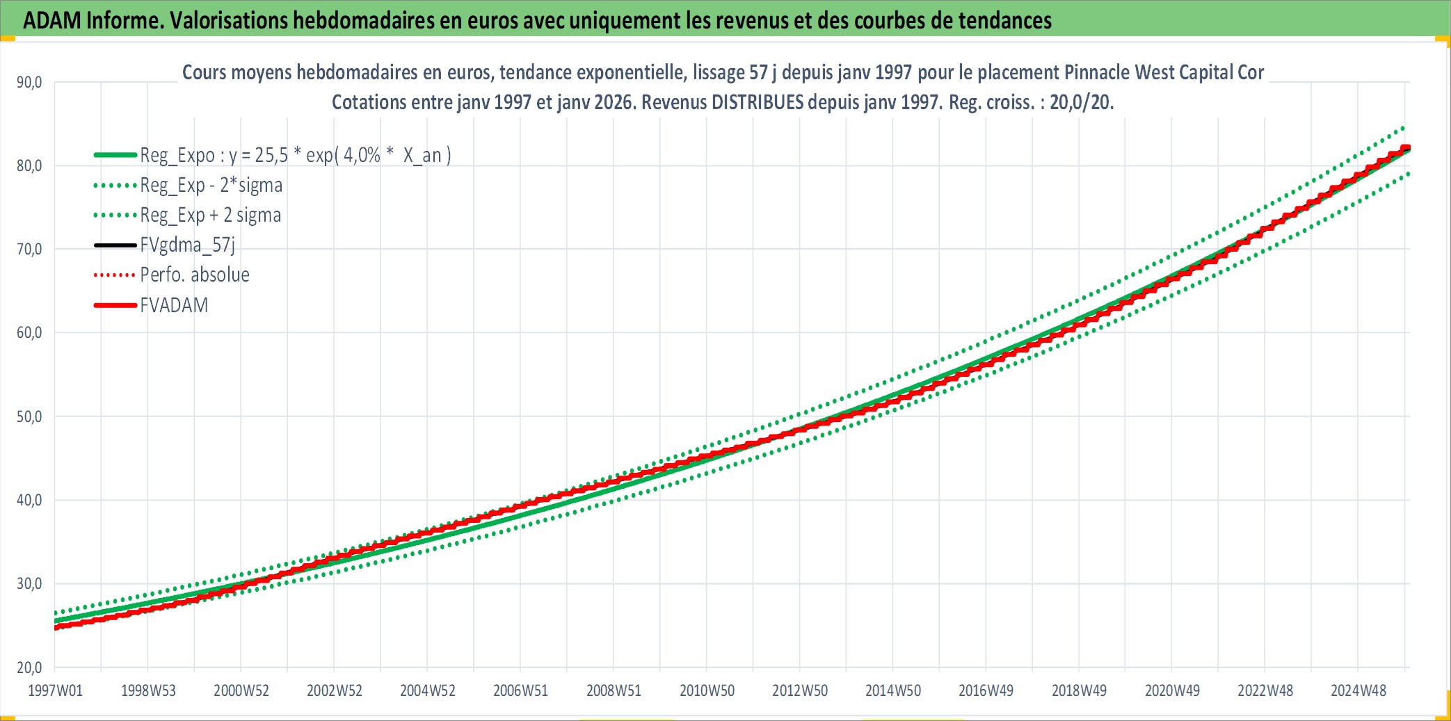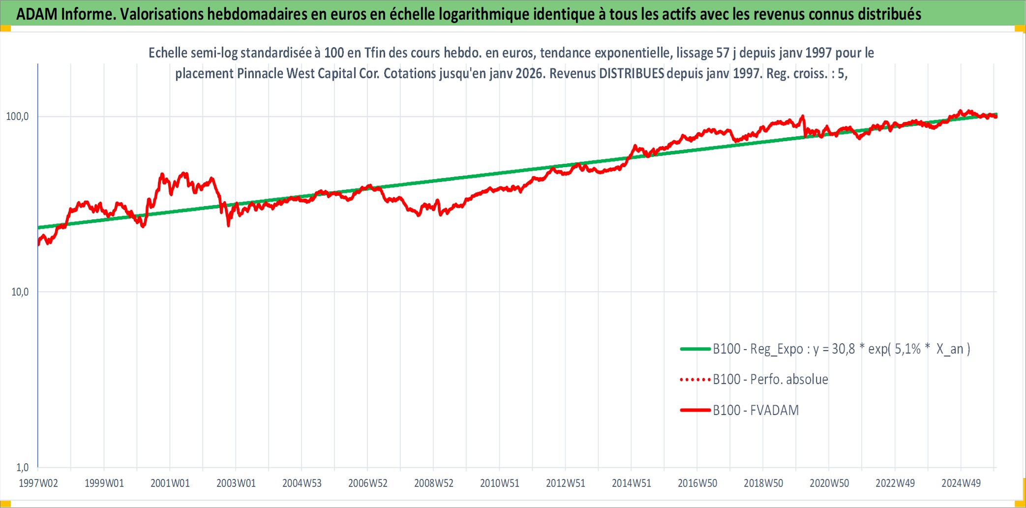 Site dédié aux investisseursPage dédiée sur site financeAnalyse des valorisations hebdomadaires de l'action Pinnacle West Capital Corp. Cet actif est cote en USD. Les valorisations sont en contrevaleur EURO et couvrent les semaines 1997W01 a 2026W01. Les revenus de cet actif financier sont pris en compte depuis la semaine 1997W05. La note globale ESG de cet actif est estimee a 5.0 (apres rebasage entre 0 et 20).