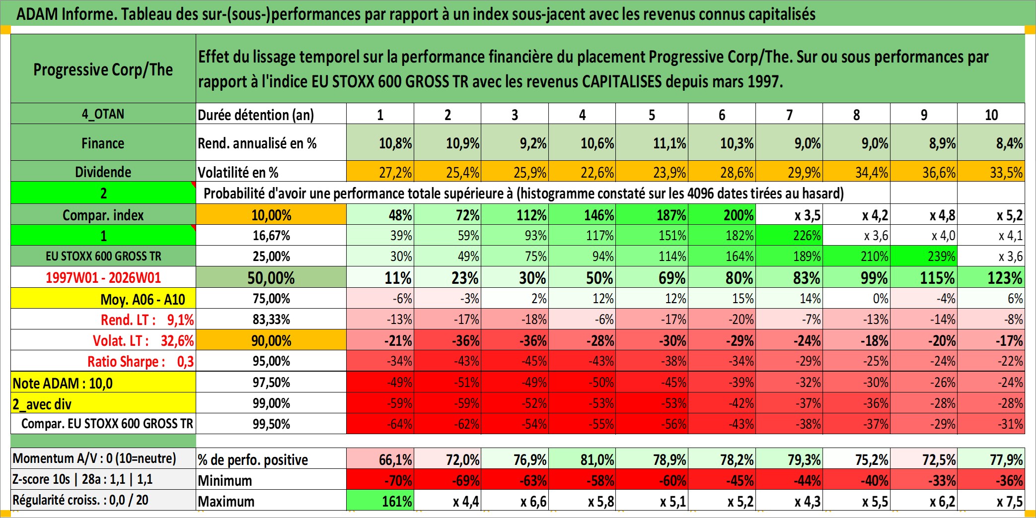 Site dédié aux investisseursPage dédiée sur site financeAnalyse des valorisations hebdomadaires de l'action Progressive Corp/The. Cet actif est cote en USD. Les valorisations sont en contrevaleur EURO et couvrent les semaines 1997W01 a 2026W01. Les revenus de cet actif financier sont pris en compte depuis la semaine 1997W11. La note globale ESG de cet actif est estimee a 10.0 (apres rebasage entre 0 et 20).