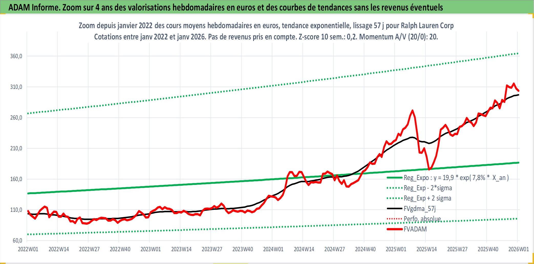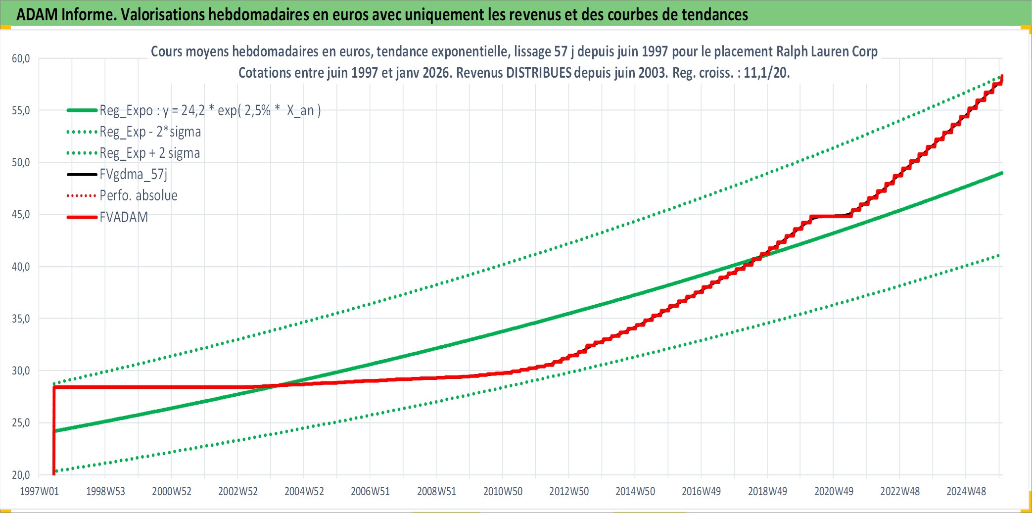 Site dédié aux investisseursPage dédiée sur site financeAnalyse des valorisations hebdomadaires de l'action Ralph Lauren Corp. Cet actif est cote en USD. Les valorisations sont en contrevaleur EURO et couvrent les semaines 1997W24 a 2026W01. Les revenus de cet actif financier sont pris en compte depuis la semaine 2003W26. La note globale ESG de cet actif est estimee a 15.0 (apres rebasage entre 0 et 20).
