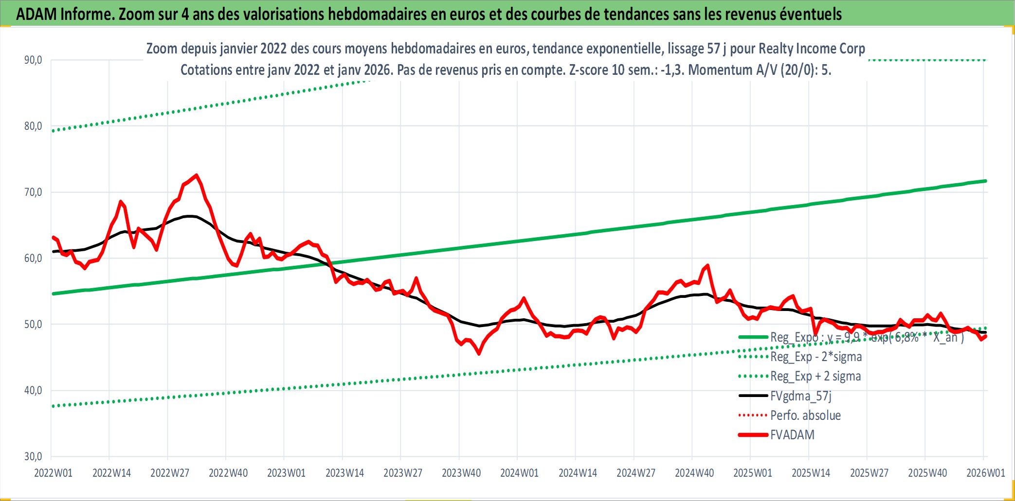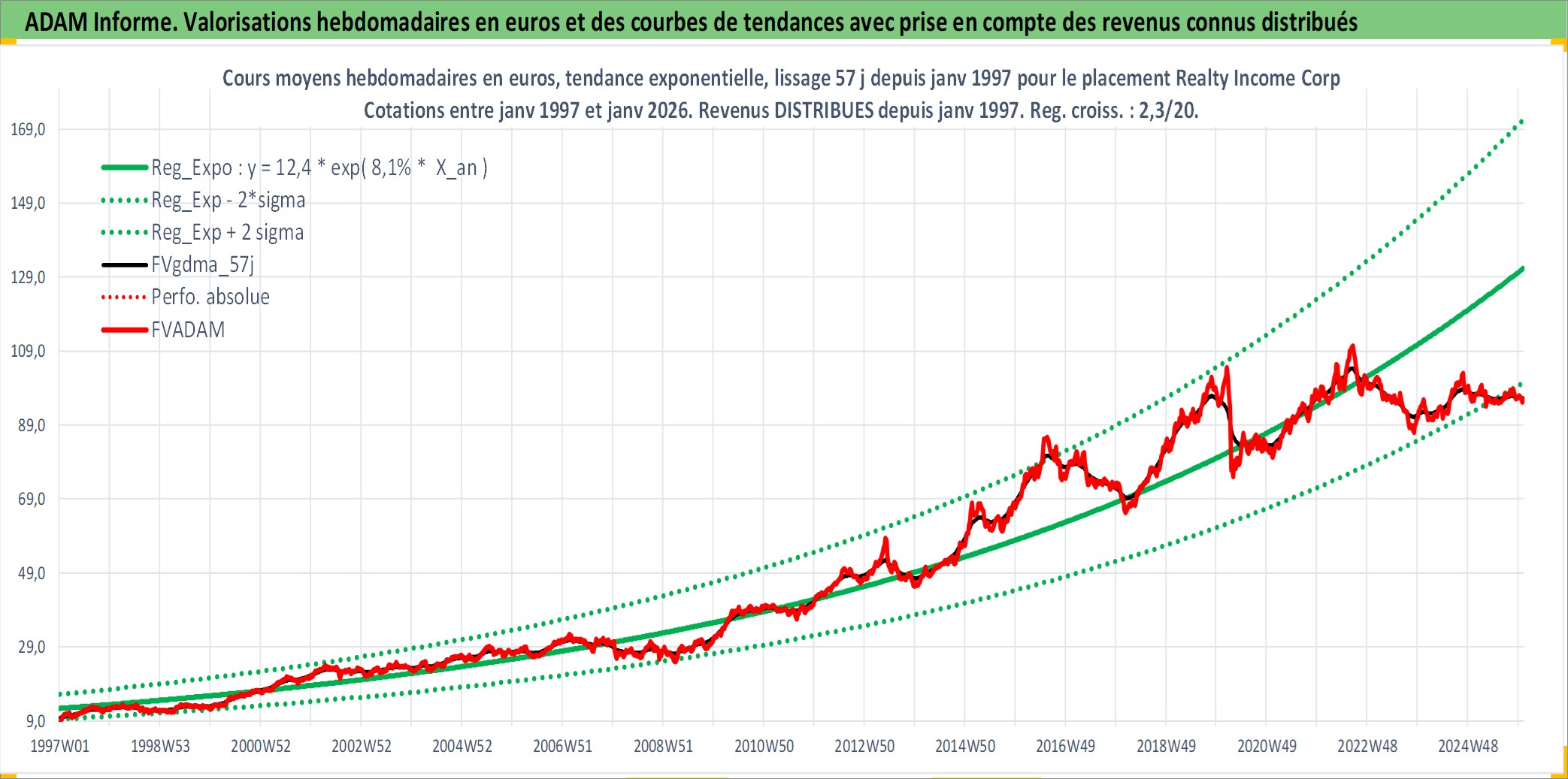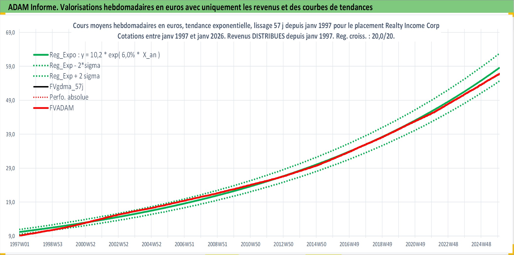Site dédié aux investisseursPage dédiée sur site financeAnalyse des valorisations hebdomadaires de l'action Realty Income Corp. Cet actif est cote en USD. Les valorisations sont en contrevaleur EURO et couvrent les semaines 1997W01 a 2026W01. Les revenus de cet actif financier sont pris en compte depuis la semaine 1997W05. La note globale ESG de cet actif est estimee a 13.0 (apres rebasage entre 0 et 20).