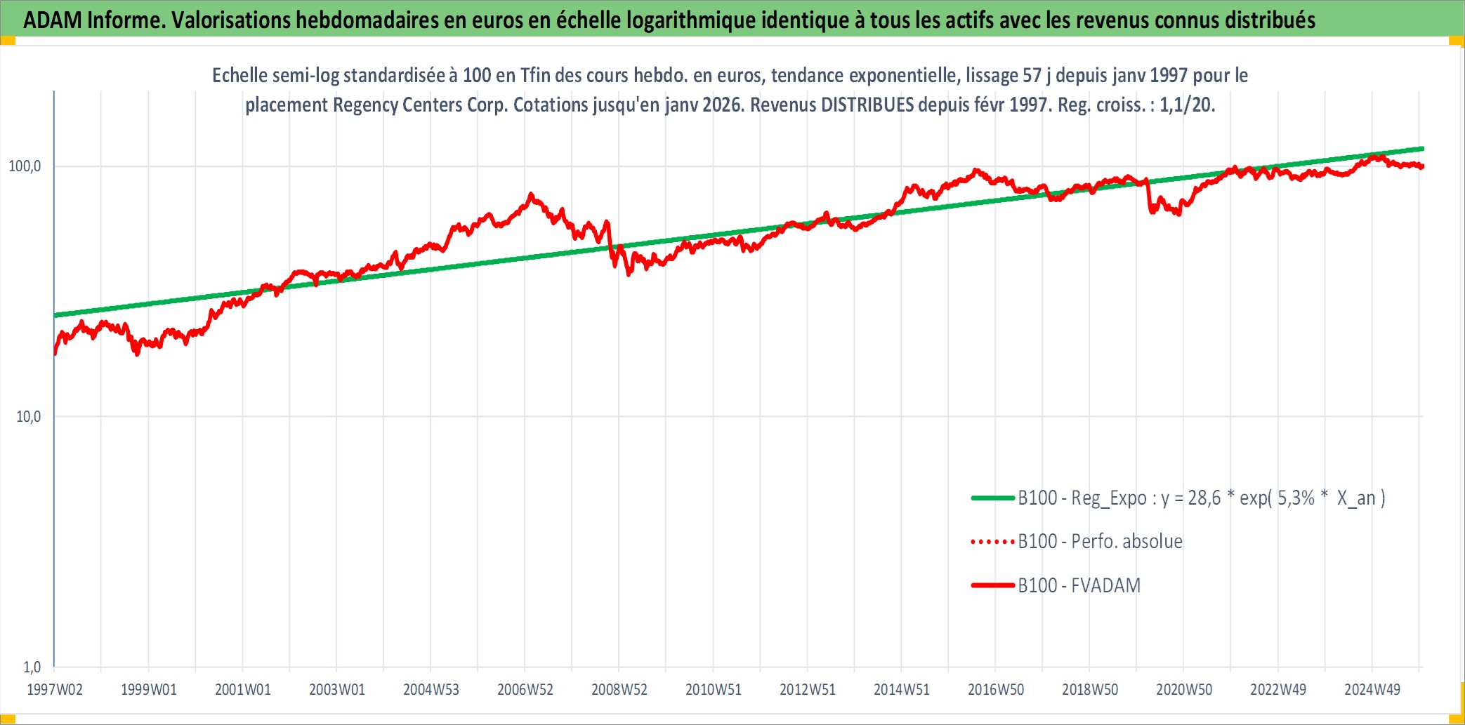 Site dédié aux investisseursPage dédiée sur site financeAnalyse des valorisations hebdomadaires de l'action Regency Centers Corp. Cet actif est cote en USD. Les valorisations sont en contrevaleur EURO et couvrent les semaines 1997W01 a 2026W01. Les revenus de cet actif financier sont pris en compte depuis la semaine 1997W07. La note globale ESG de cet actif est estimee a 16.0 (apres rebasage entre 0 et 20).