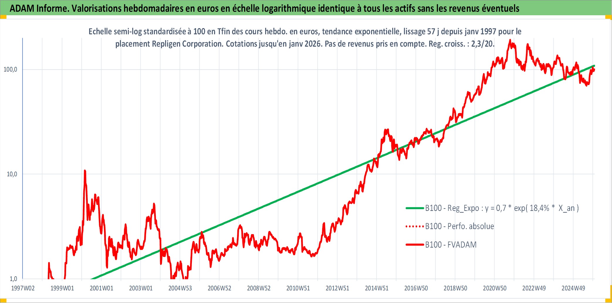 Site dédié aux investisseursPage dédiée sur site financeAnalyse des valorisations hebdomadaires de l'action Repligen Corporation. Cet actif est cote en USD. Les valorisations sont en contrevaleur EURO et couvrent les semaines 1997W01 a 2026W01. Les revenus de cet actif financier ne sont pas connus car non existants ou non disponibles sur le site Yahoo Finance. La note ESG de cet actif n'est pas connue.