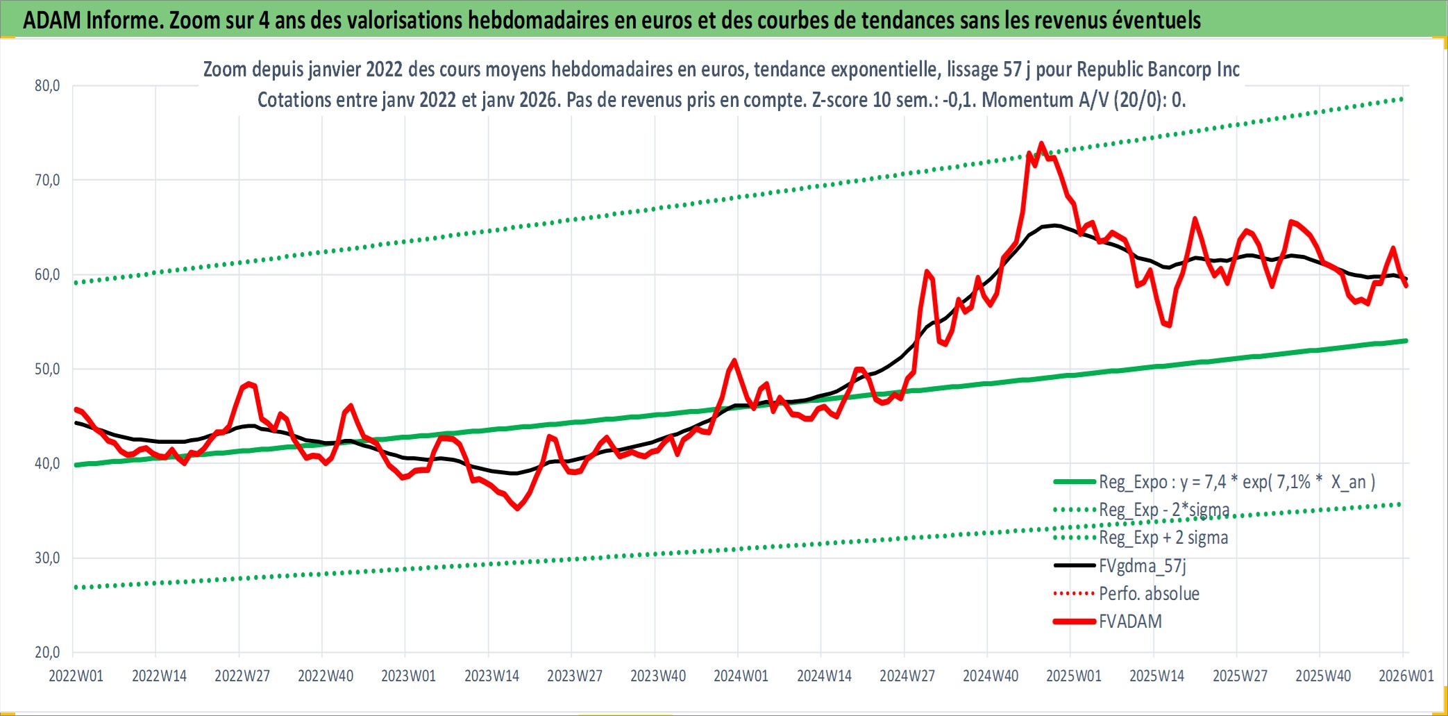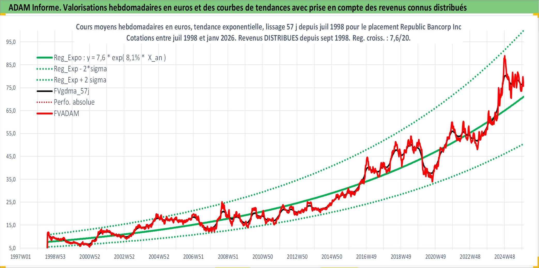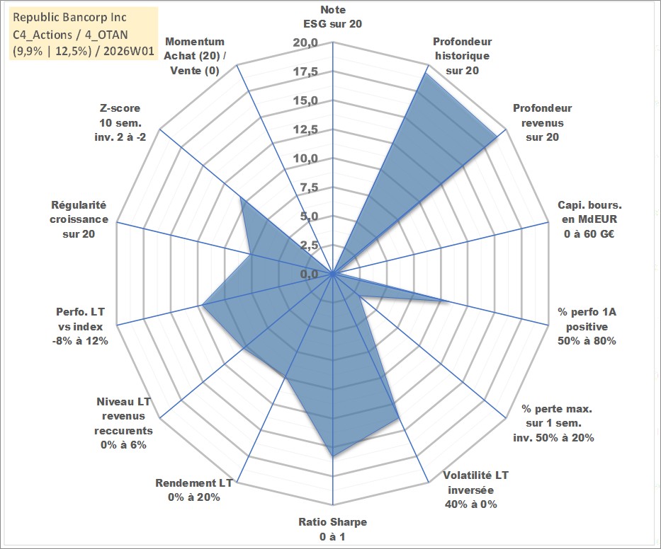 Site dédié aux investisseursPage dédiée sur site financeAnalyse des valorisations hebdomadaires de l'action Republic Bancorp Inc. Cet actif est cote en USD. Les valorisations sont en contrevaleur EURO et couvrent les semaines 1998W30 a 2026W01. Les revenus de cet actif financier sont pris en compte depuis la semaine 1998W38. La note ESG de cet actif n'est pas connue.