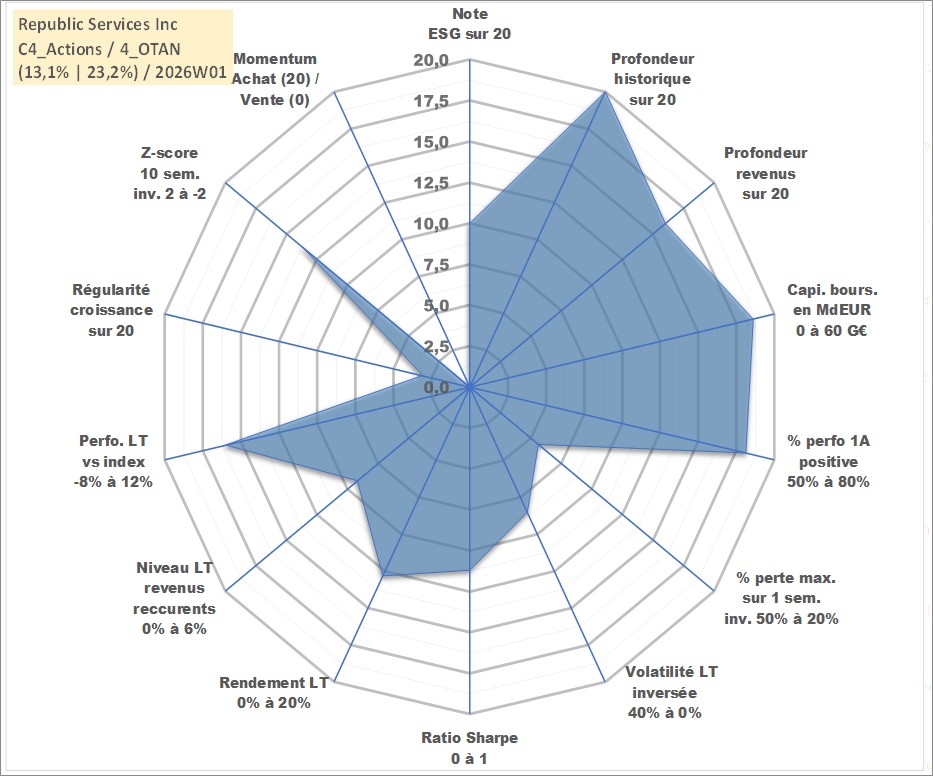 Site dédié aux investisseursPage dédiée sur site financeAnalyse des valorisations hebdomadaires de l'action Republic Services Inc. Cet actif est cote en USD. Les valorisations sont en contrevaleur EURO et couvrent les semaines 1998W27 a 2026W01. Les revenus de cet actif financier sont pris en compte depuis la semaine 2003W39. La note globale ESG de cet actif est estimee a 10.0 (apres rebasage entre 0 et 20).