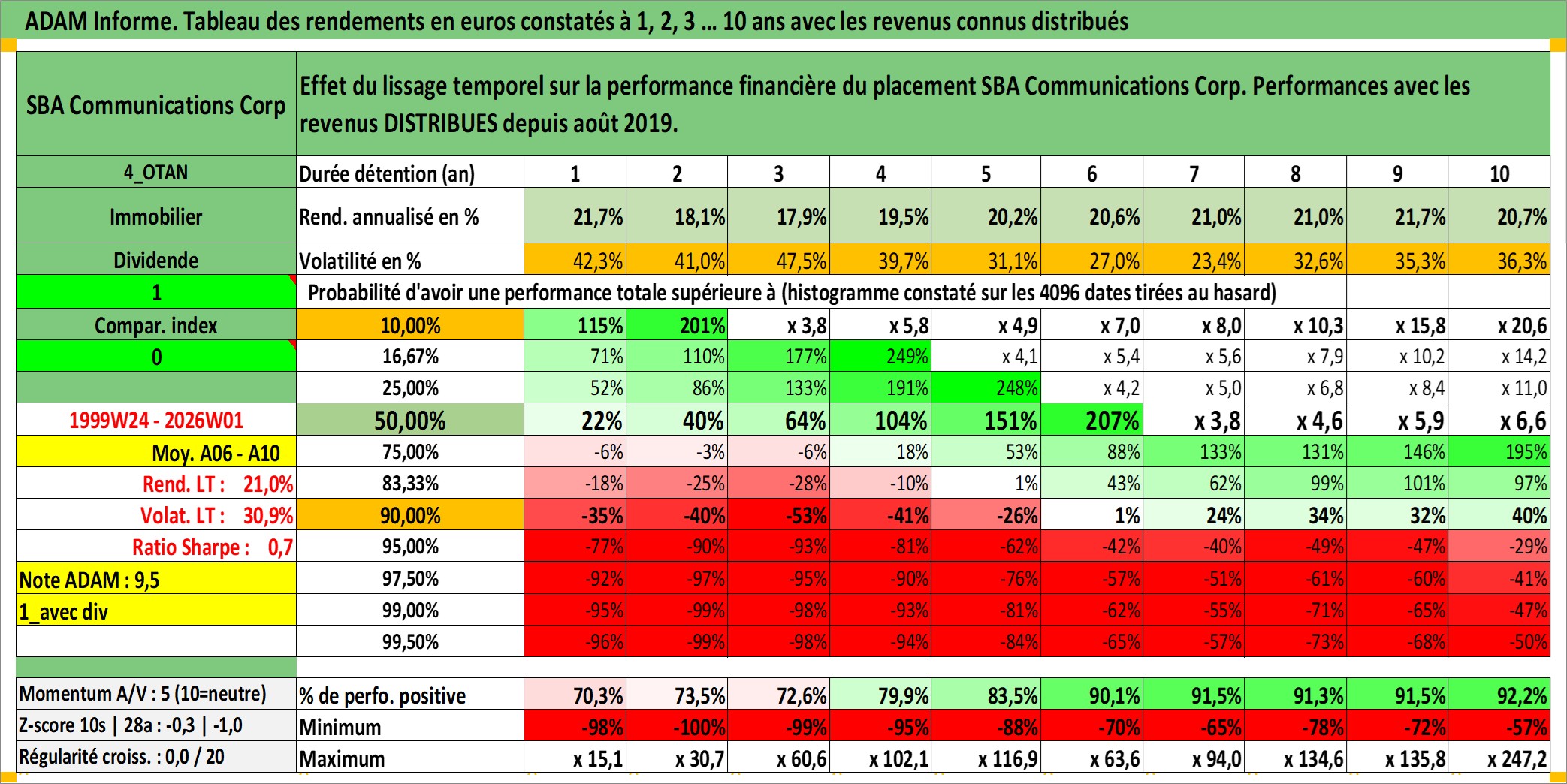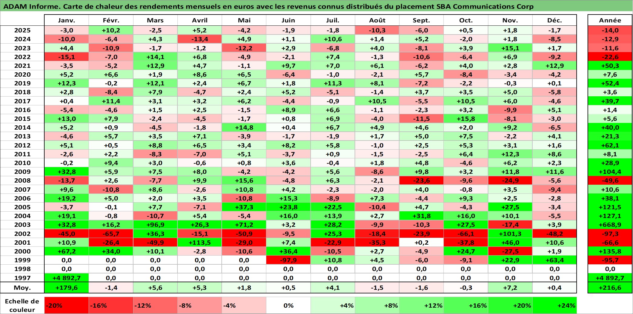 Site dédié aux investisseursPage dédiée sur site financeAnalyse des valorisations hebdomadaires de l'action SBA Communications Corp. Cet actif est cote en USD. Les valorisations sont en contrevaleur EURO et couvrent les semaines 1999W24 a 2026W01. Les revenus de cet actif financier sont pris en compte depuis la semaine 2019W35. La note globale ESG de cet actif est estimee a 15.0 (apres rebasage entre 0 et 20).