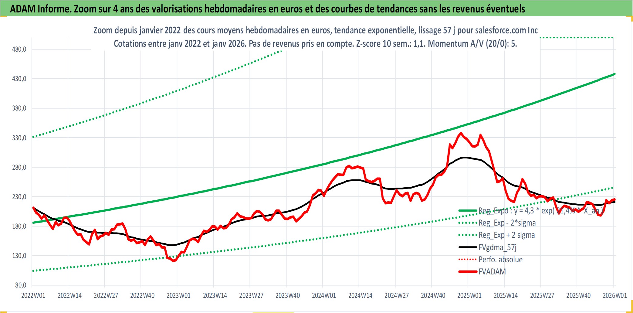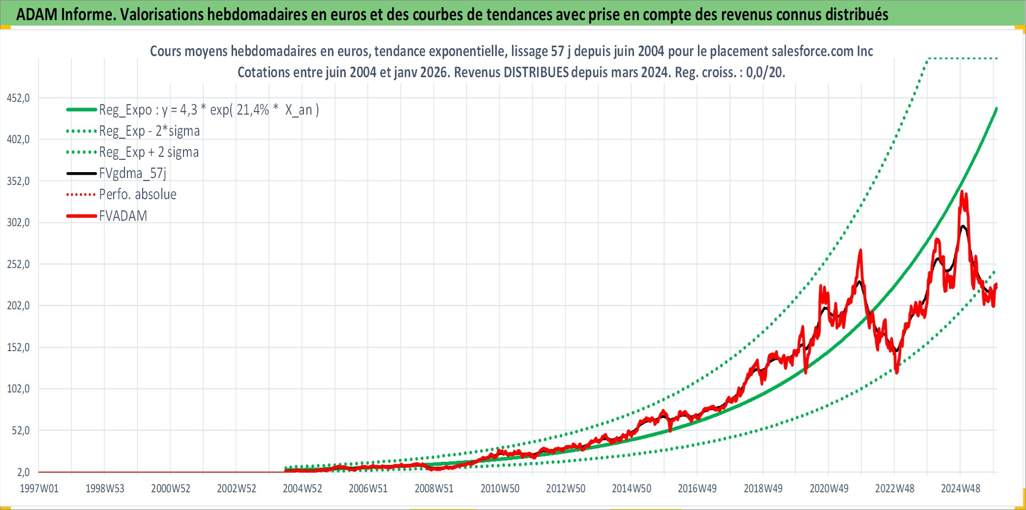Site dédié aux investisseursPage dédiée sur site financeAnalyse des valorisations hebdomadaires de l'action salesforce.com Inc. Cet actif est cote en USD. Les valorisations sont en contrevaleur EURO et couvrent les semaines 2004W26 a 2026W01. Les revenus de cet actif financier sont pris en compte depuis la semaine 2024W11. La note globale ESG de cet actif est estimee a 15.0 (apres rebasage entre 0 et 20).