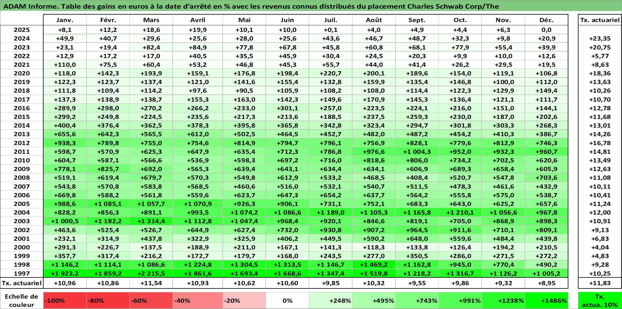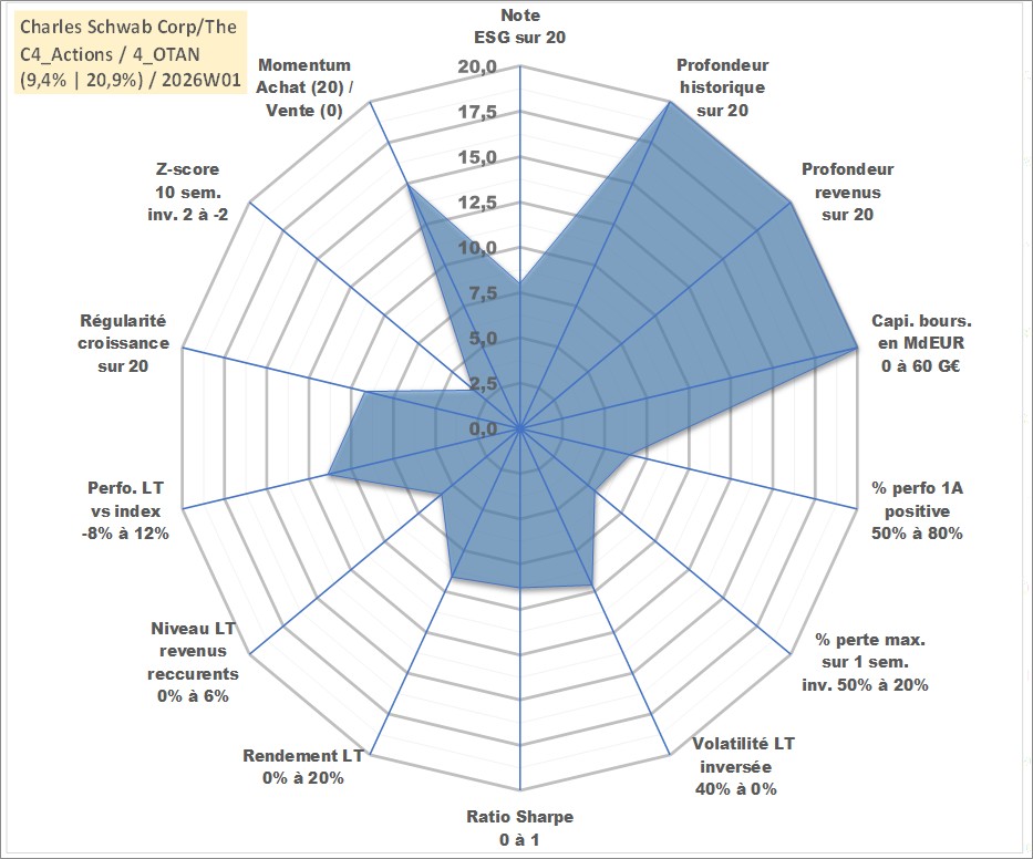 Site dédié aux investisseursPage dédiée sur site financeAnalyse des valorisations hebdomadaires de l'action Charles Schwab Corp/The. Cet actif est cote en USD. Les valorisations sont en contrevaleur EURO et couvrent les semaines 1997W01 a 2026W01. Les revenus de cet actif financier sont pris en compte depuis la semaine 1997W07. La note globale ESG de cet actif est estimee a 8.0 (apres rebasage entre 0 et 20).