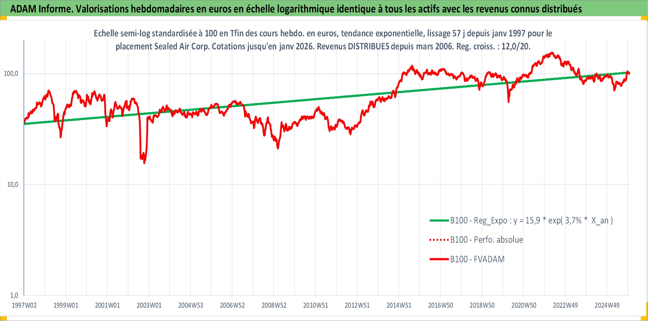 Site dédié aux investisseursPage dédiée sur site financeAnalyse des valorisations hebdomadaires de l'action Sealed Air Corp. Cet actif est cote en USD. Les valorisations sont en contrevaleur EURO et couvrent les semaines 1997W01 a 2026W01. Les revenus de cet actif financier sont pris en compte depuis la semaine 2006W09. La note globale ESG de cet actif est estimee a 10.0 (apres rebasage entre 0 et 20).