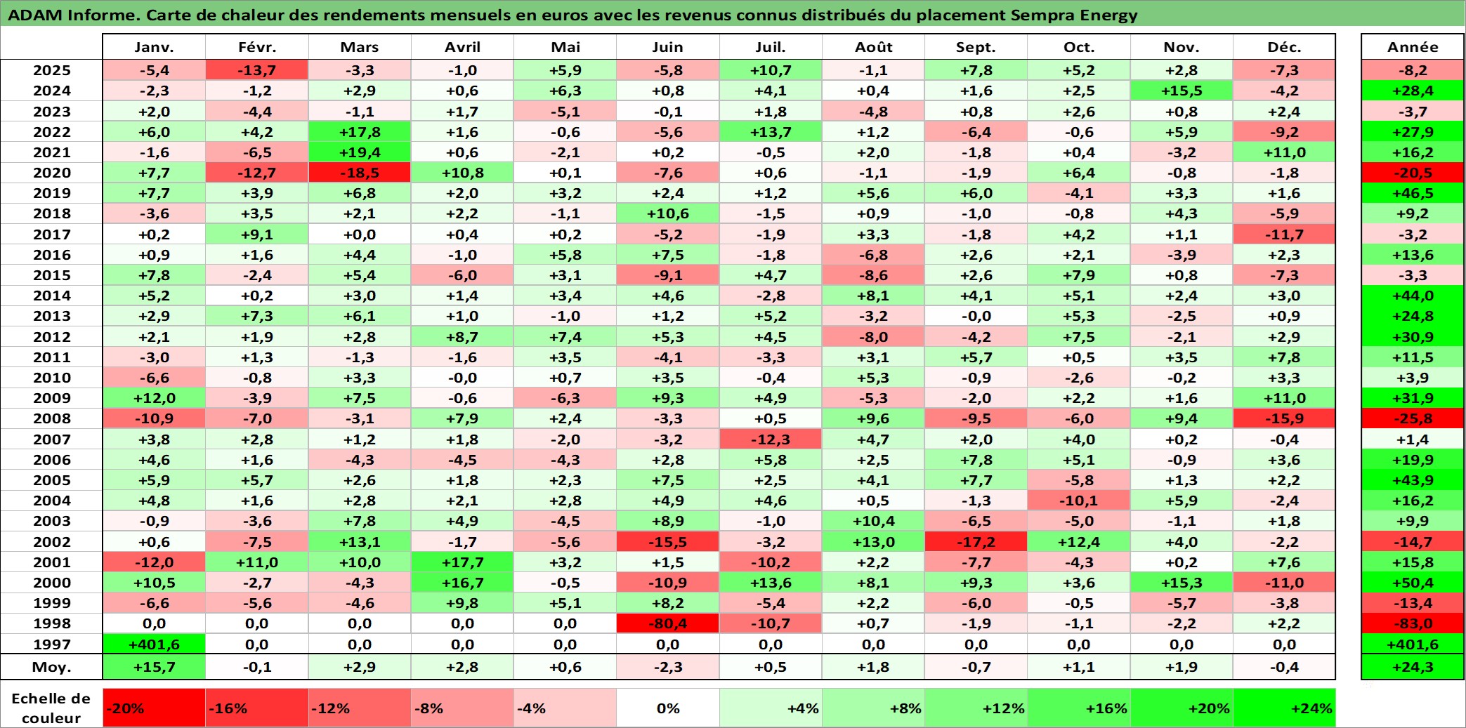 Site dédié aux investisseursPage dédiée sur site financeAnalyse des valorisations hebdomadaires de l'action Sempra Energy. Cet actif est cote en USD. Les valorisations sont en contrevaleur EURO et couvrent les semaines 1998W27 a 2026W01. Les revenus de cet actif financier sont pris en compte depuis la semaine 1998W38. La note globale ESG de cet actif est estimee a 7.0 (apres rebasage entre 0 et 20).