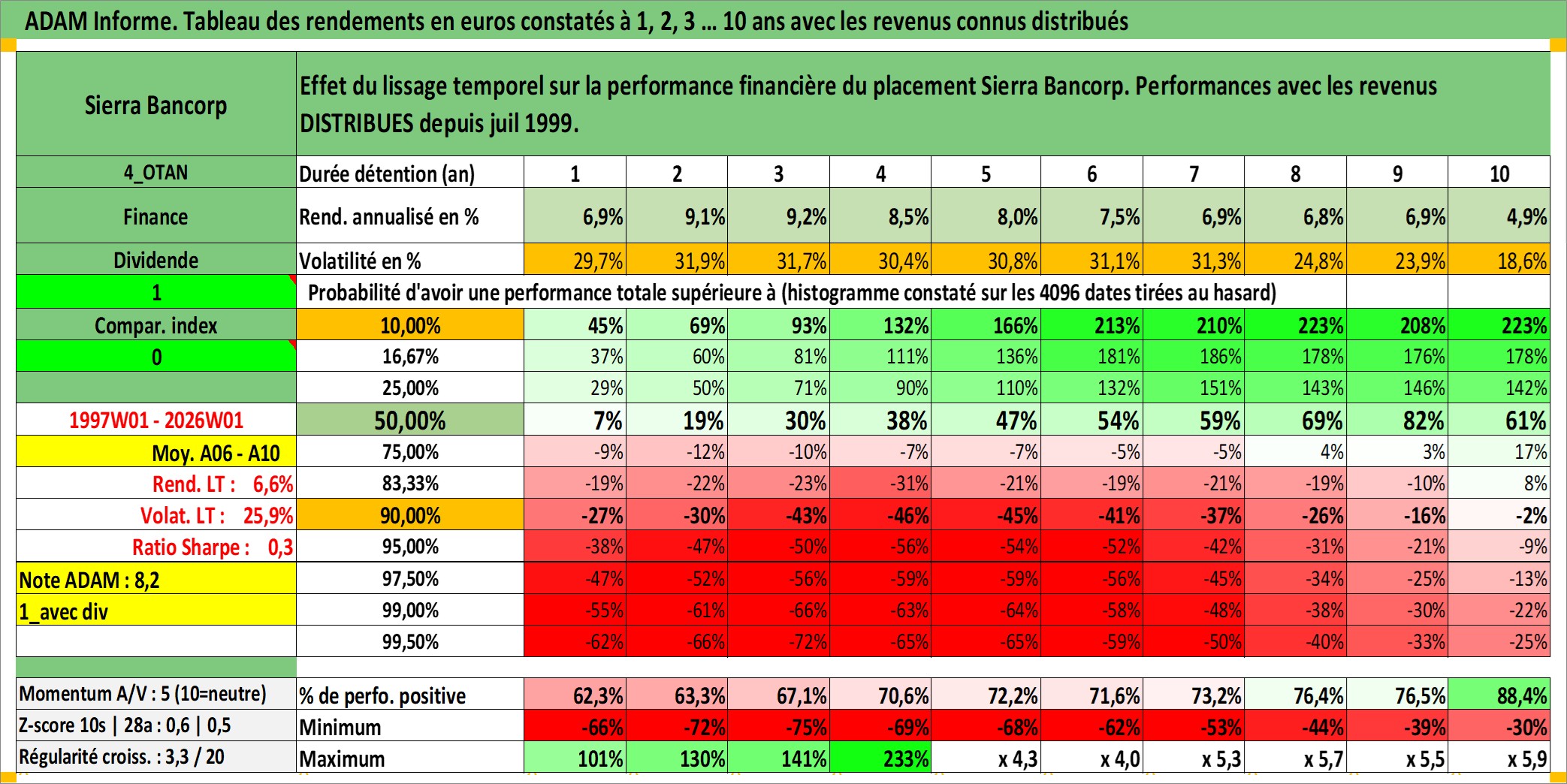 Site dédié aux investisseursPage dédiée sur site financeAnalyse des valorisations hebdomadaires de l'action Sierra Bancorp. Cet actif est cote en USD. Les valorisations sont en contrevaleur EURO et couvrent les semaines 1997W01 a 2026W01. Les revenus de cet actif financier sont pris en compte depuis la semaine 1999W29. La note ESG de cet actif n'est pas connue.