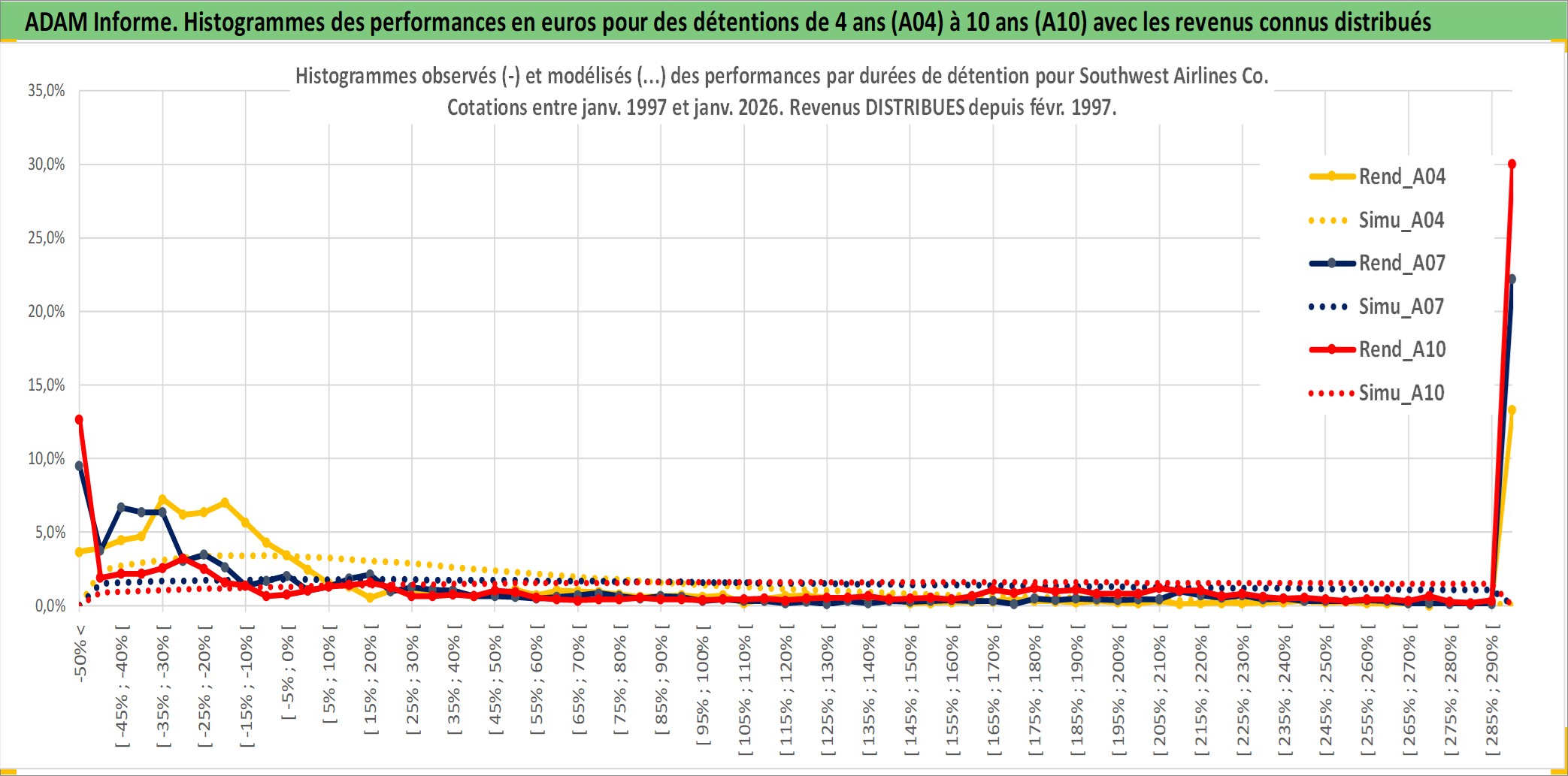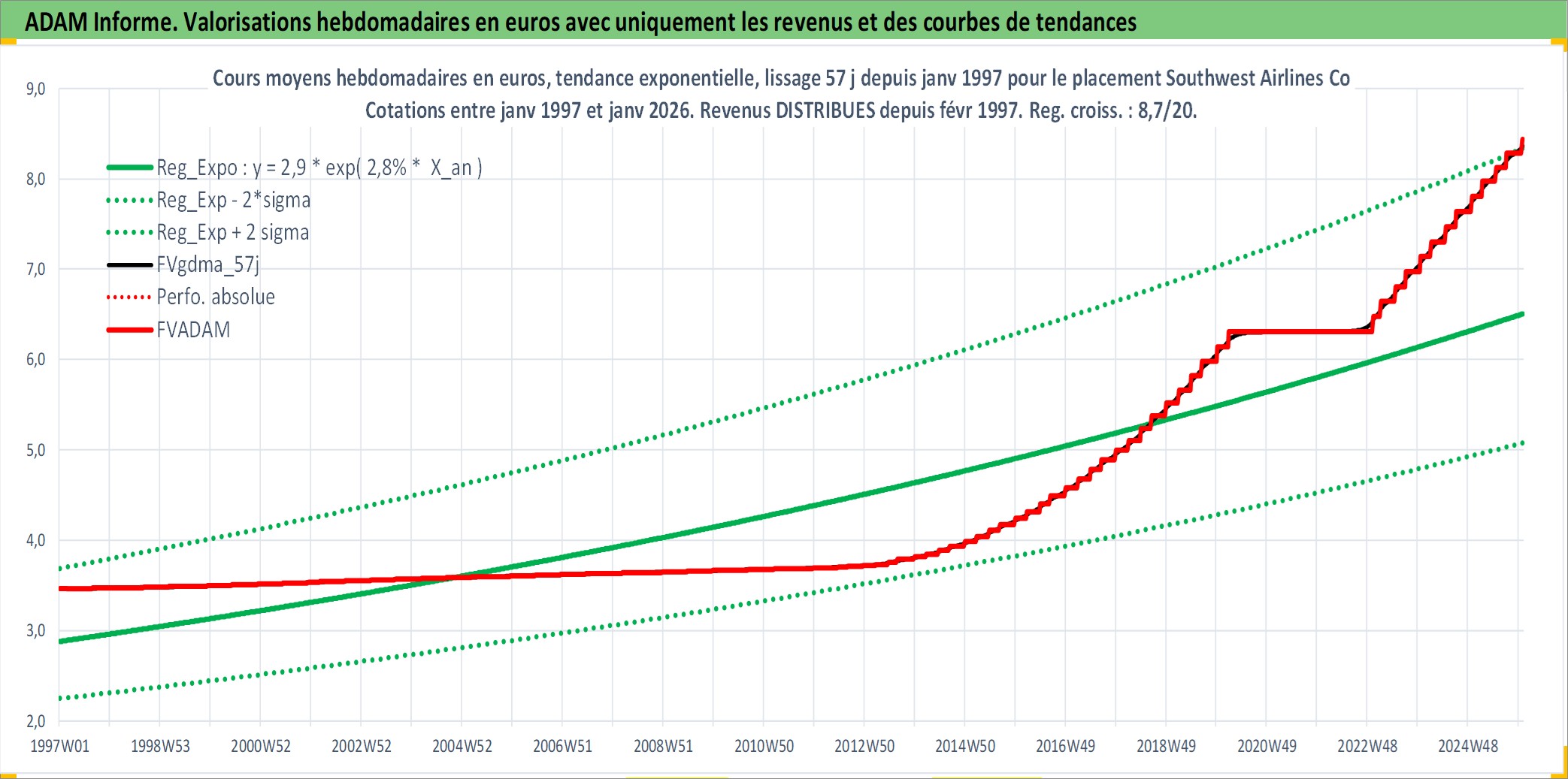 Site dédié aux investisseursPage dédiée sur site financeAnalyse des valorisations hebdomadaires de l'action Southwest Airlines Co. Cet actif est cote en USD. Les valorisations sont en contrevaleur EURO et couvrent les semaines 1997W01 a 2026W01. Les revenus de cet actif financier sont pris en compte depuis la semaine 1997W09. La note globale ESG de cet actif est estimee a 4.0 (apres rebasage entre 0 et 20).
