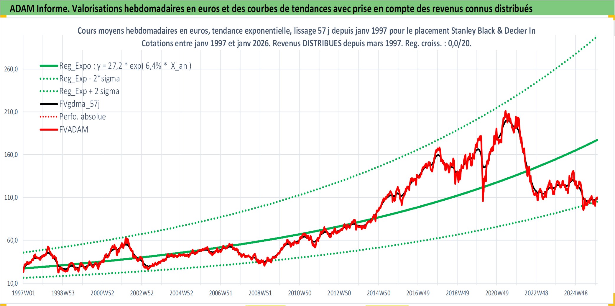 Site dédié aux investisseursPage dédiée sur site financeAnalyse des valorisations hebdomadaires de l'action Stanley Black & Decker Inc. Cet actif est cote en USD. Les valorisations sont en contrevaleur EURO et couvrent les semaines 1997W01 a 2026W01. Les revenus de cet actif financier sont pris en compte depuis la semaine 1997W10. La note globale ESG de cet actif est estimee a 7.0 (apres rebasage entre 0 et 20).