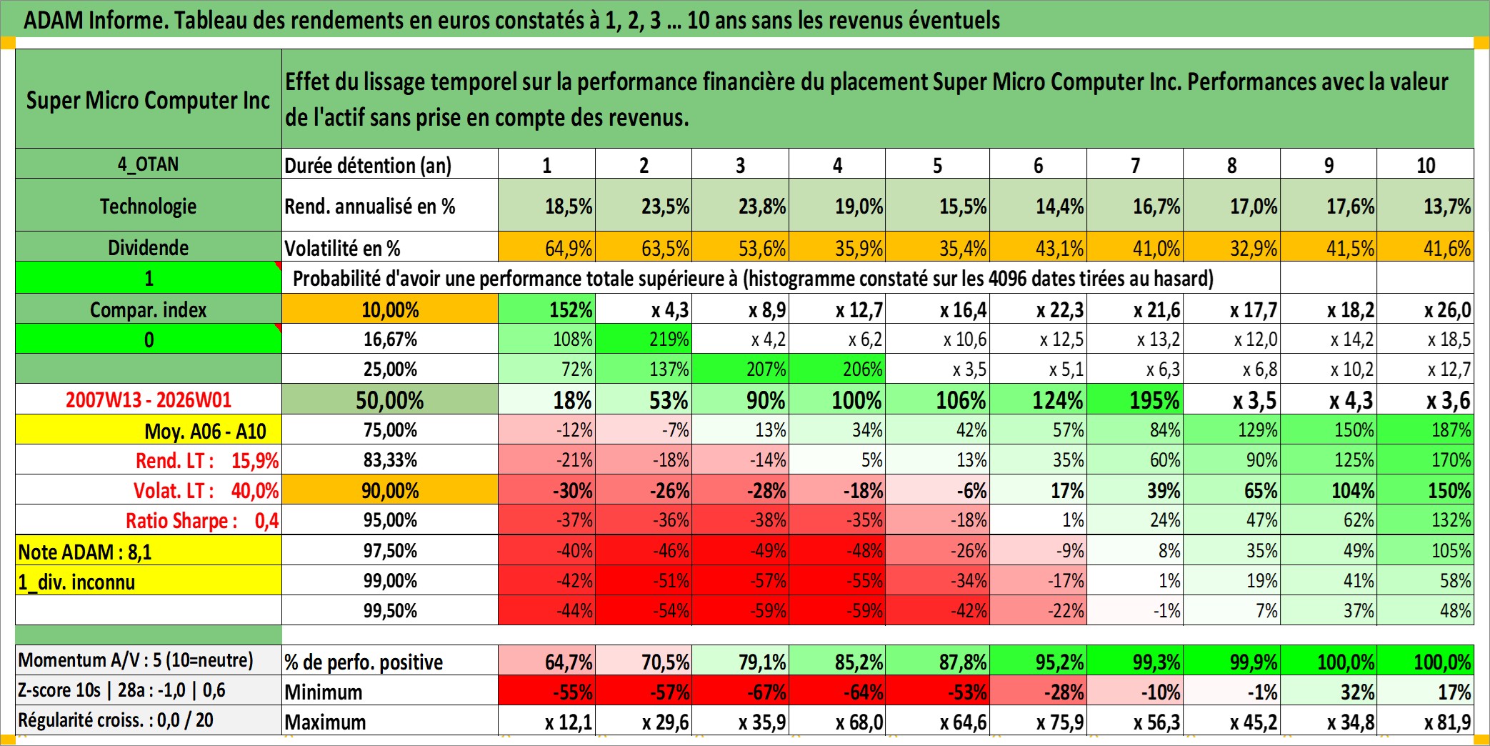 Site dédié aux investisseursPage dédiée sur site financeAnalyse des valorisations hebdomadaires de l'action Super Micro Computer Inc. Cet actif est cote en USD. Les valorisations sont en contrevaleur EURO et couvrent les semaines 2007W13 a 2026W01. Les revenus de cet actif financier ne sont pas connus car non existants ou non disponibles sur le site Yahoo Finance. La note ESG de cet actif n'est pas connue.