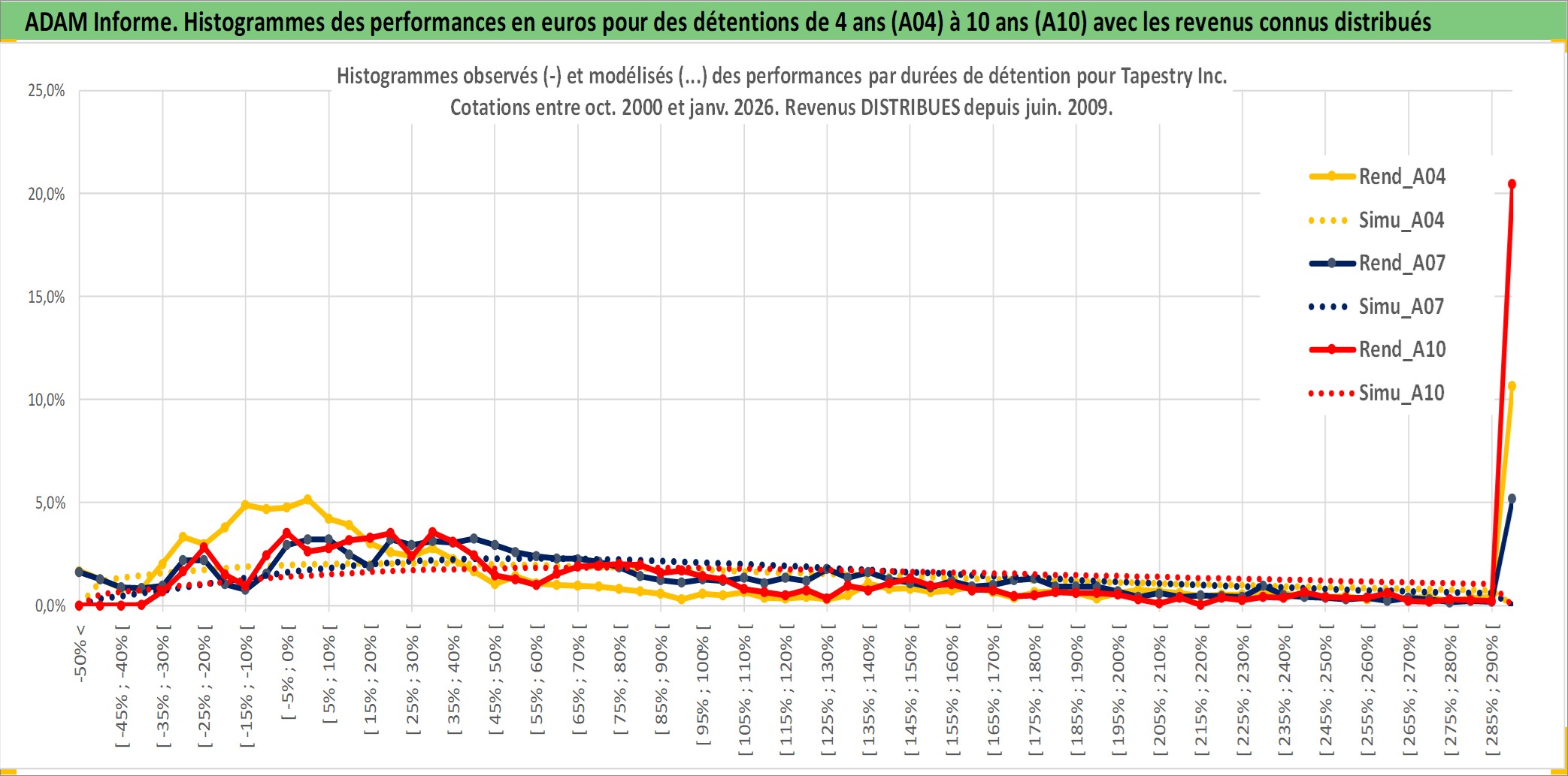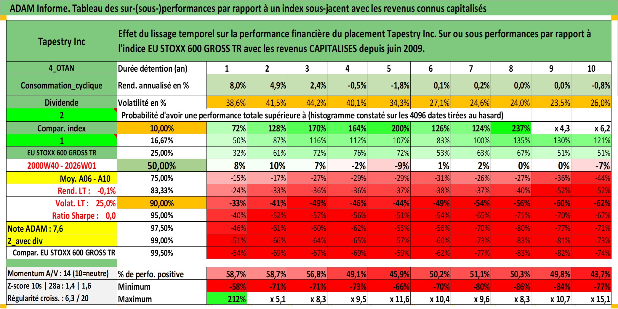 Site dédié aux investisseursPage dédiée sur site financeAnalyse des valorisations hebdomadaires de l'action Tapestry Inc. Cet actif est cote en USD. Les valorisations sont en contrevaleur EURO et couvrent les semaines 2000W40 a 2026W01. Les revenus de cet actif financier sont pris en compte depuis la semaine 2009W23. La note globale ESG de cet actif est estimee a 15.0 (apres rebasage entre 0 et 20).