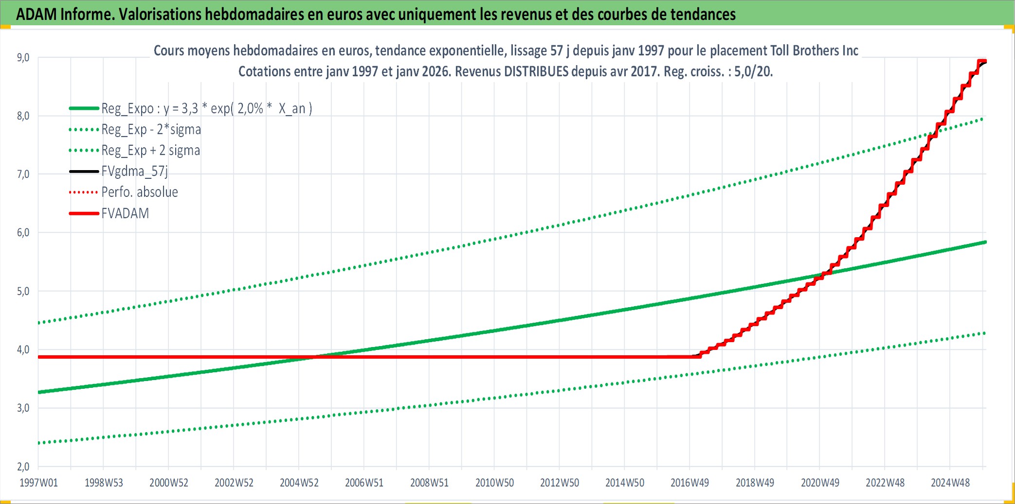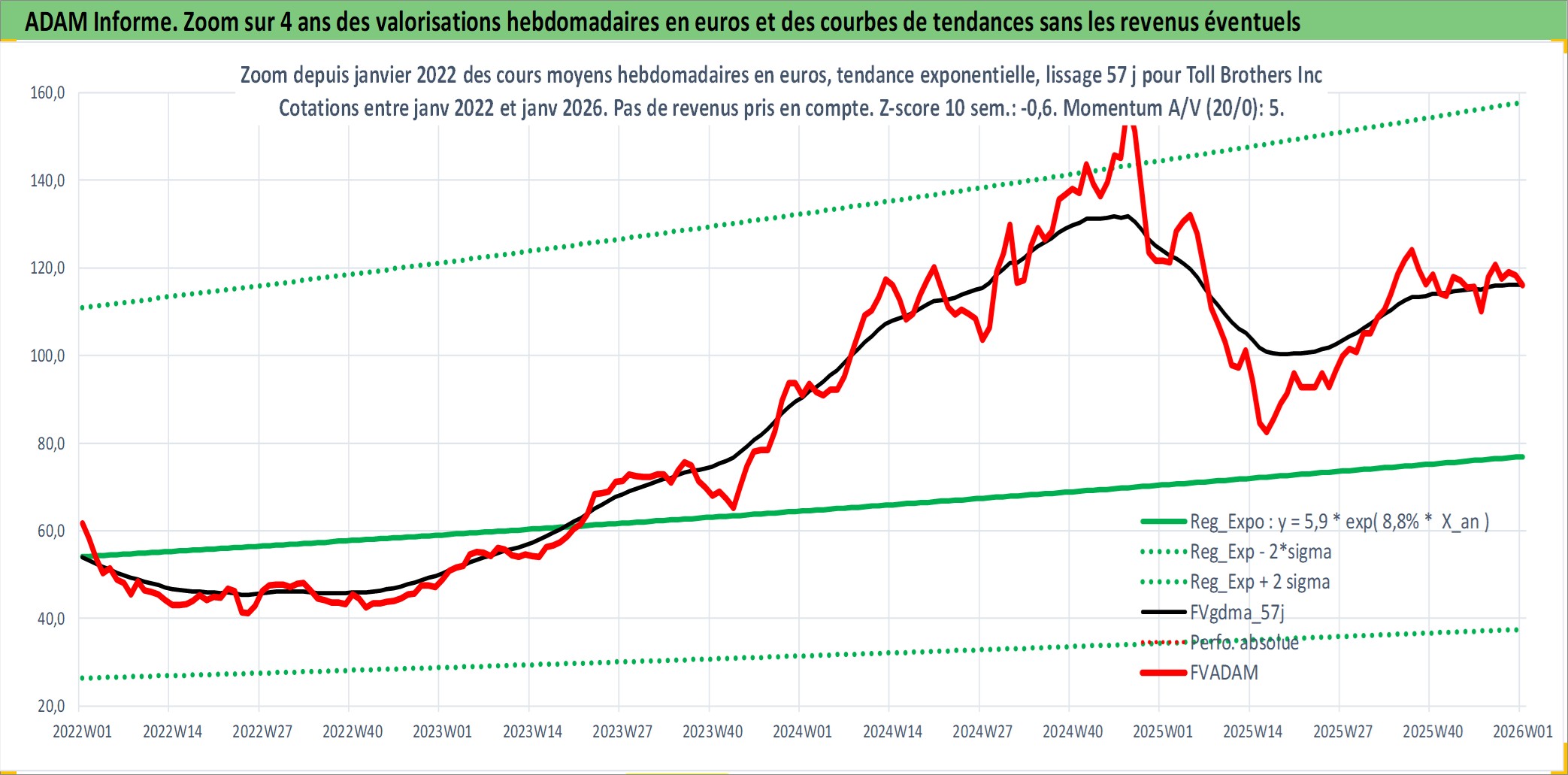 Site dédié aux investisseursPage dédiée sur site financeAnalyse des valorisations hebdomadaires de l'action Toll Brothers Inc. Cet actif est cote en USD. Les valorisations sont en contrevaleur EURO et couvrent les semaines 1997W01 a 2026W01. Les revenus de cet actif financier sont pris en compte depuis la semaine 2017W15. La note globale ESG de cet actif est estimee a 9.0 (apres rebasage entre 0 et 20).