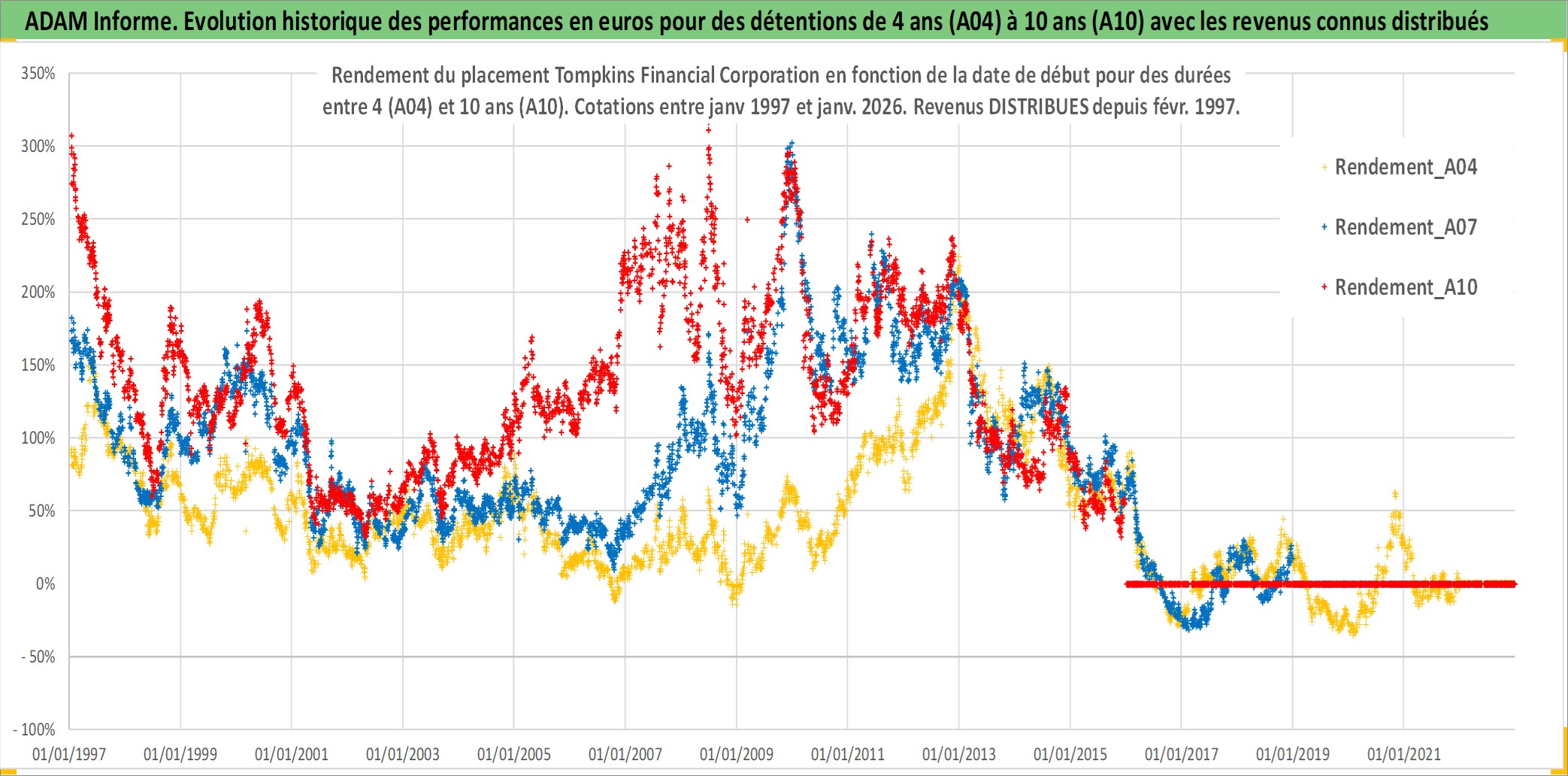 Site dédié aux investisseursPage dédiée sur site financeAnalyse des valorisations hebdomadaires de l'action Tompkins Financial Corporation. Cet actif est cote en USD. Les valorisations sont en contrevaleur EURO et couvrent les semaines 1997W01 a 2026W01. Les revenus de cet actif financier sont pris en compte depuis la semaine 1997W09. La note ESG de cet actif n'est pas connue.