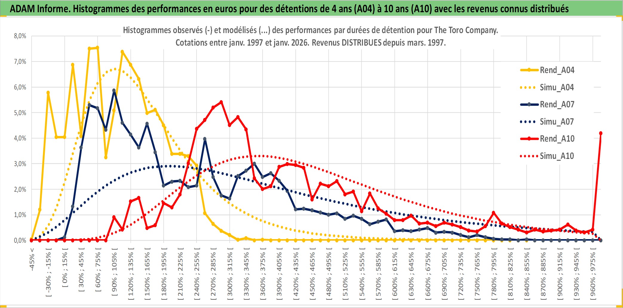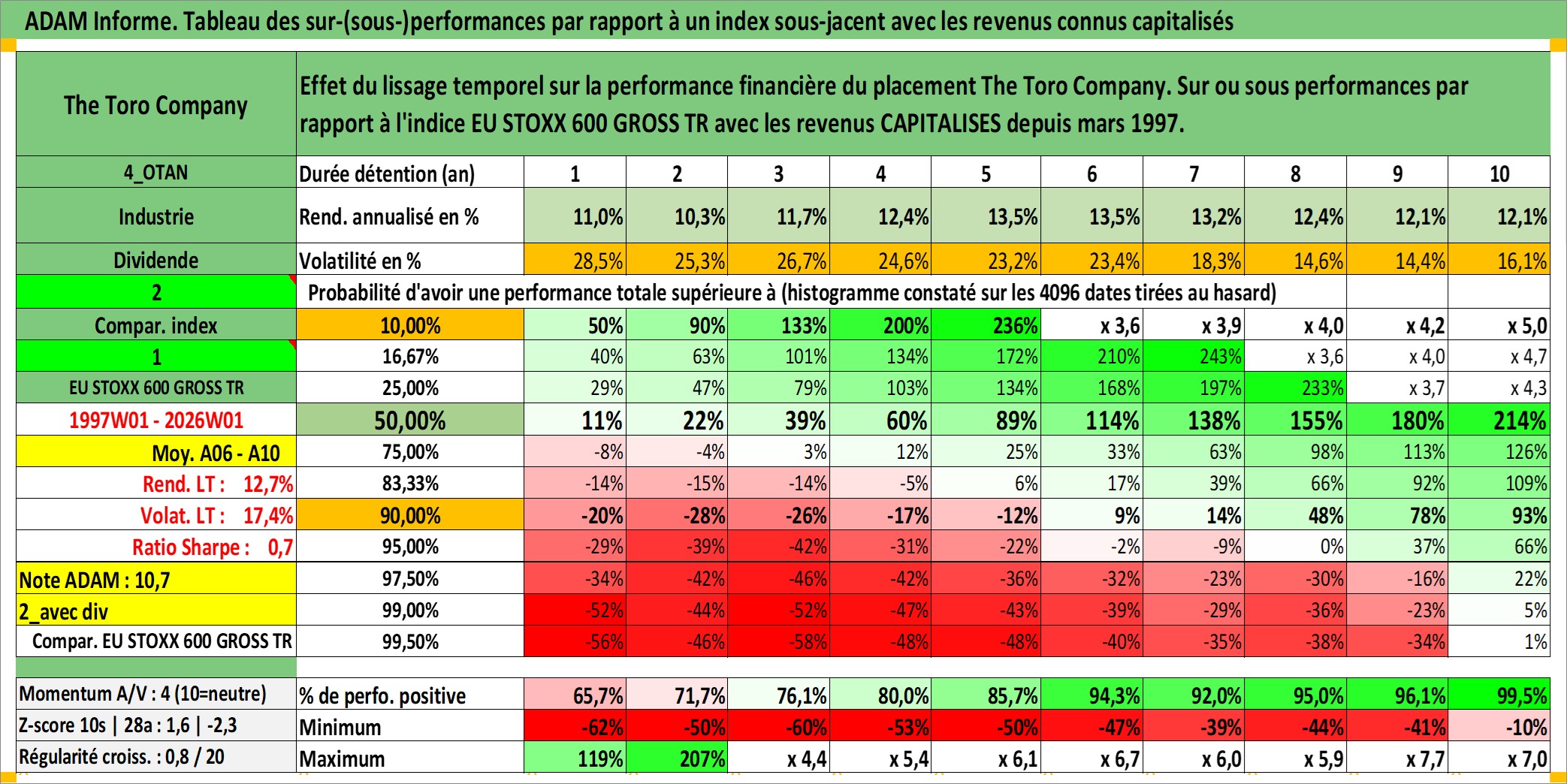Site dédié aux investisseursPage dédiée sur site financeAnalyse des valorisations hebdomadaires de l'action The Toro Company. Cet actif est cote en USD. Les valorisations sont en contrevaleur EURO et couvrent les semaines 1997W01 a 2026W01. Les revenus de cet actif financier sont pris en compte depuis la semaine 1997W13. La note globale ESG de cet actif est estimee a 10.0 (apres rebasage entre 0 et 20).