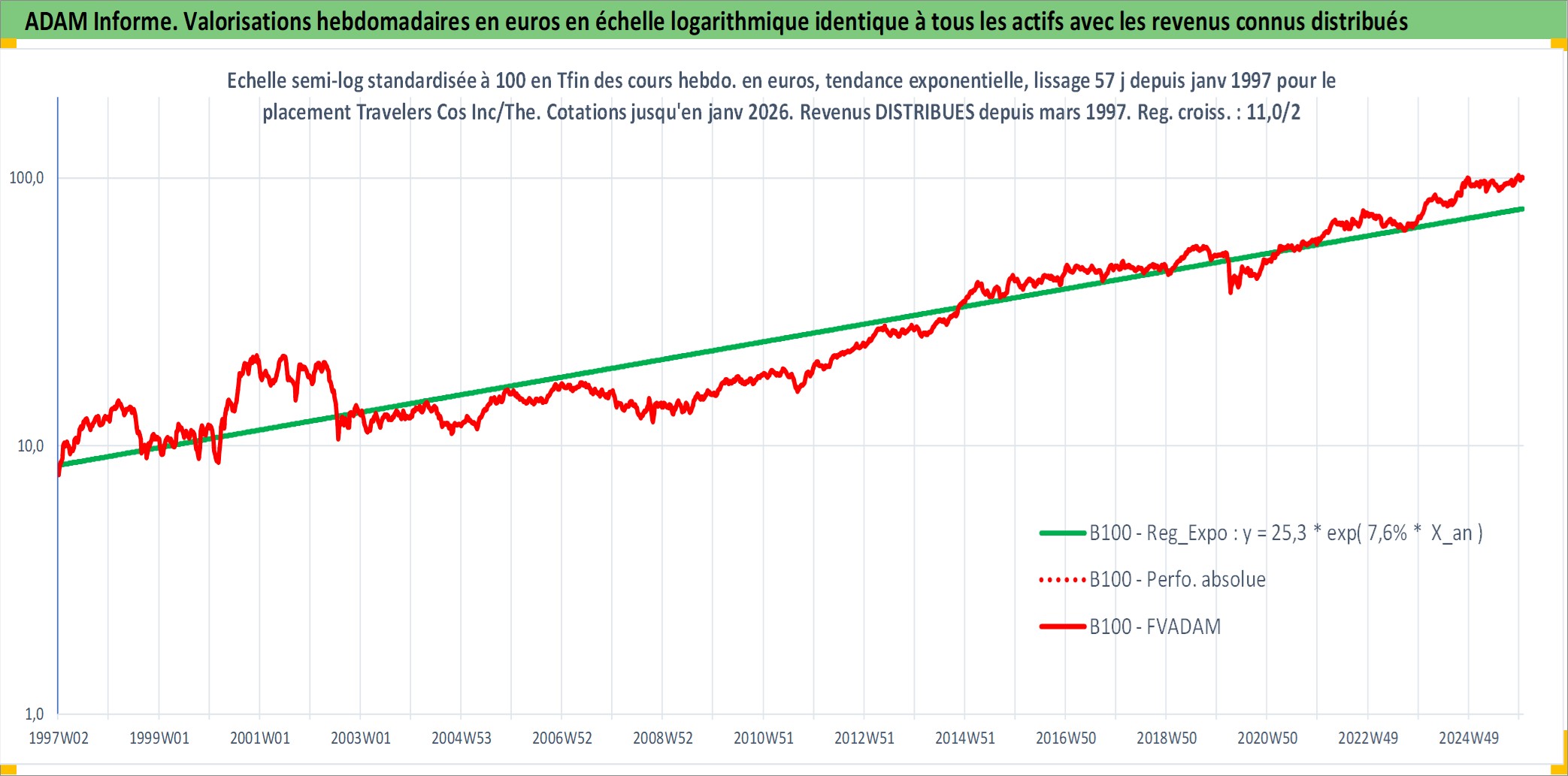 Site dédié aux investisseursPage dédiée sur site financeAnalyse des valorisations hebdomadaires de l'action Travelers Cos Inc/The. Cet actif est cote en USD. Les valorisations sont en contrevaleur EURO et couvrent les semaines 1997W01 a 2026W01. Les revenus de cet actif financier sont pris en compte depuis la semaine 1997W13. La note globale ESG de cet actif est estimee a 10.0 (apres rebasage entre 0 et 20).