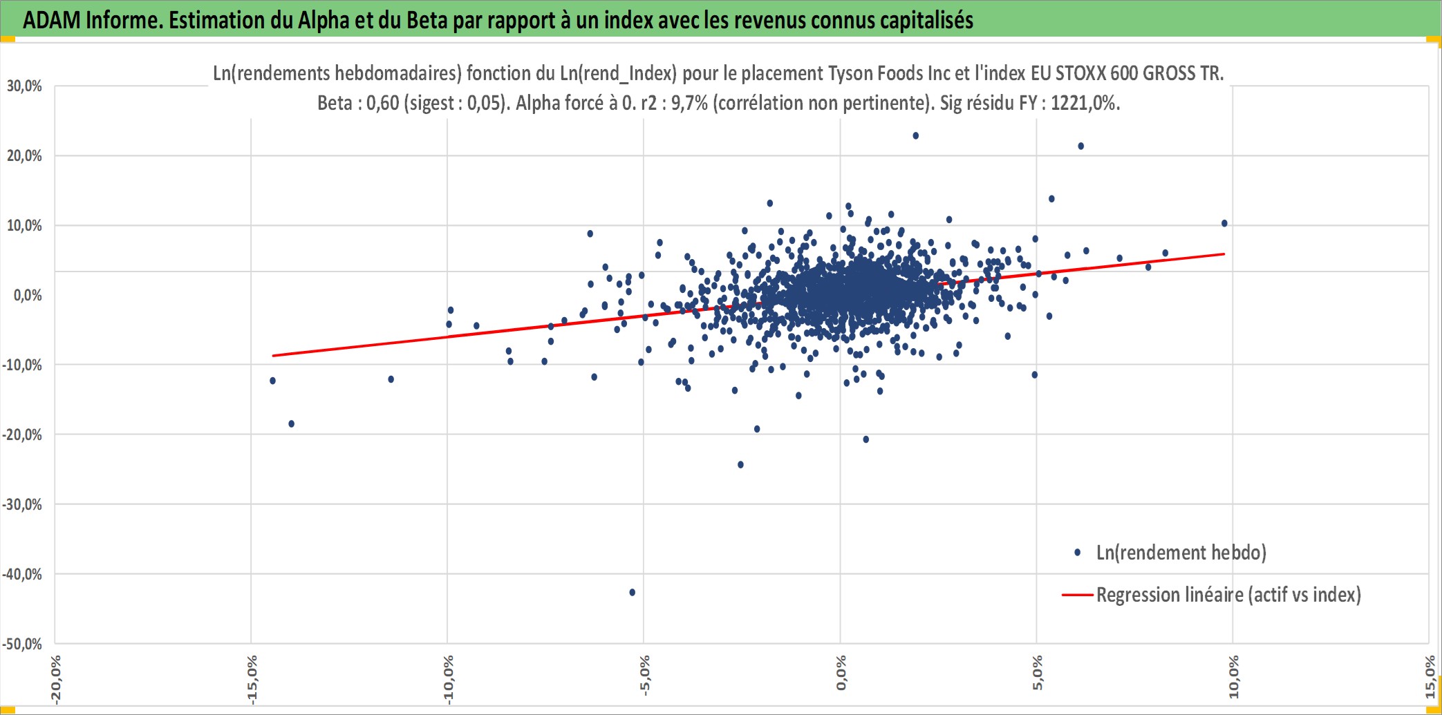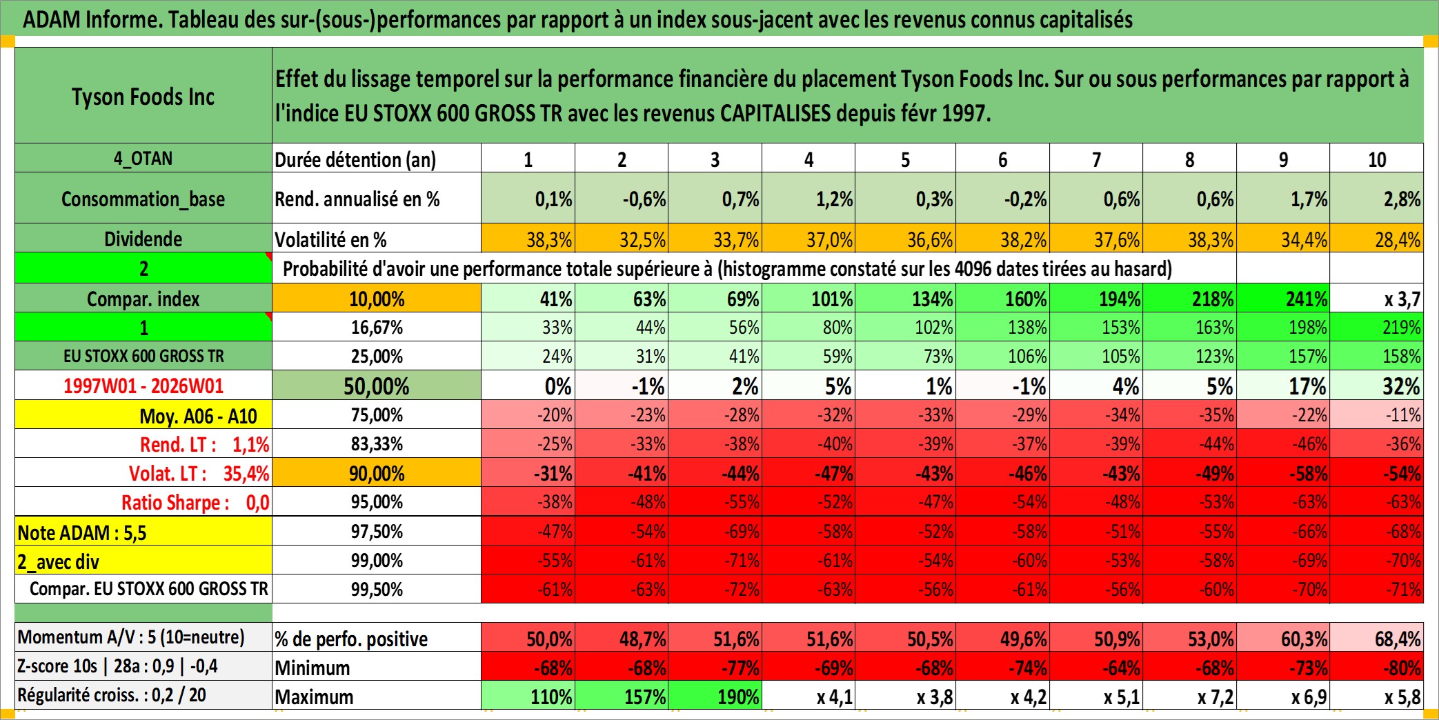Site dédié aux investisseursPage dédiée sur site financeAnalyse des valorisations hebdomadaires de l'action Tyson Foods Inc. Cet actif est cote en USD. Les valorisations sont en contrevaleur EURO et couvrent les semaines 1997W01 a 2026W01. Les revenus de cet actif financier sont pris en compte depuis la semaine 1997W09. La note globale ESG de cet actif est estimee a 3.0 (apres rebasage entre 0 et 20).
