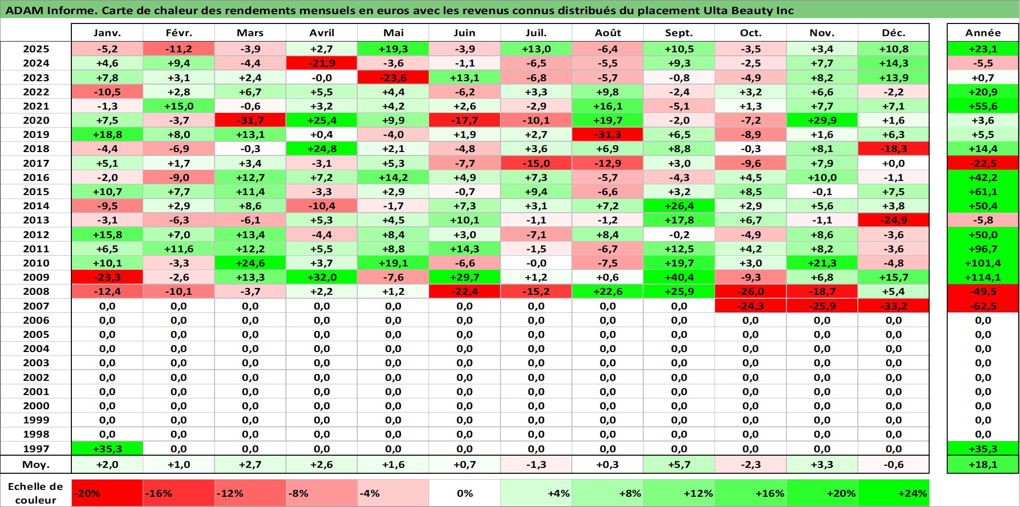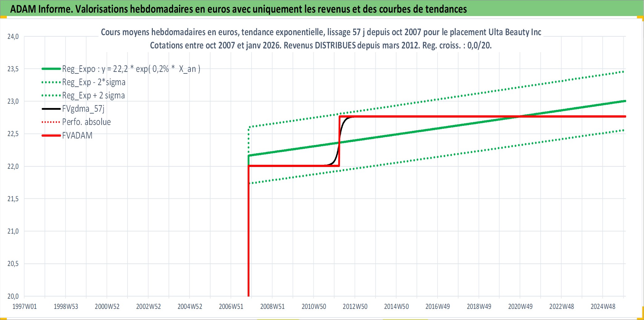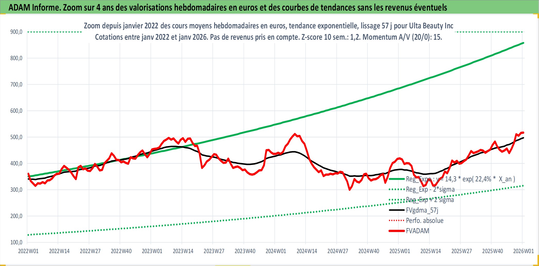 Site dédié aux investisseursPage dédiée sur site financeAnalyse des valorisations hebdomadaires de l'action Ulta Beauty Inc. Cet actif est cote en USD. Les valorisations sont en contrevaleur EURO et couvrent les semaines 2007W43 a 2026W01. Les revenus de cet actif financier sont pris en compte depuis la semaine 2012W11. La note globale ESG de cet actif est estimee a 13.0 (apres rebasage entre 0 et 20).